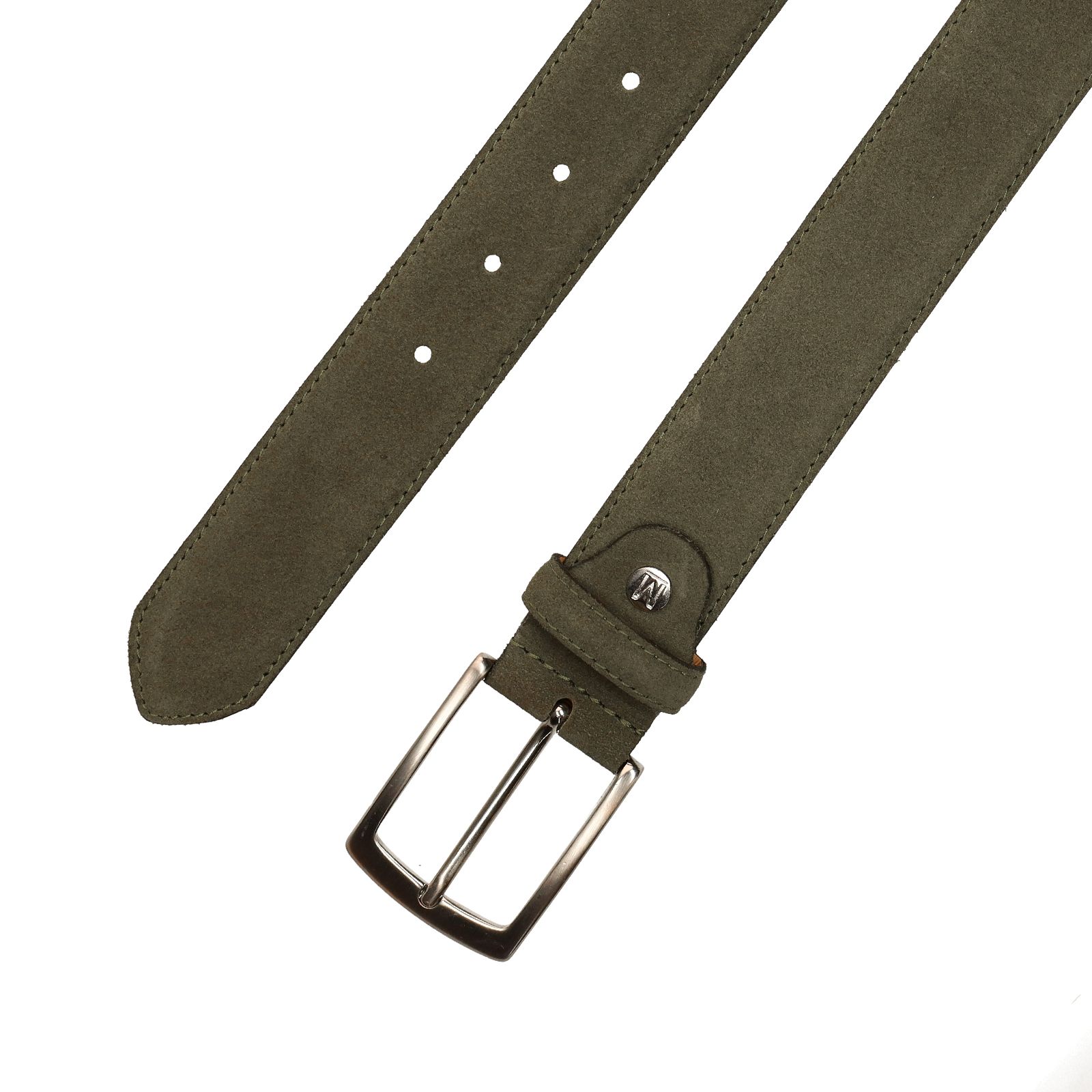 Olijfgroene suède riem van Manfield. Deze riem is gemaakt van suède en leer, we raden je daarom aan deze riem te verzorgen en beschermen met de Collonil Carbon Pro. Deze riem is voorzien van een zilverkleurige gesp.
