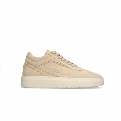 Beige leren sneakers van Manfield. De sneakers hebben een zool van 4 cm en we adviseren als verzorging en bescherming de Collonil Carbon Pro.