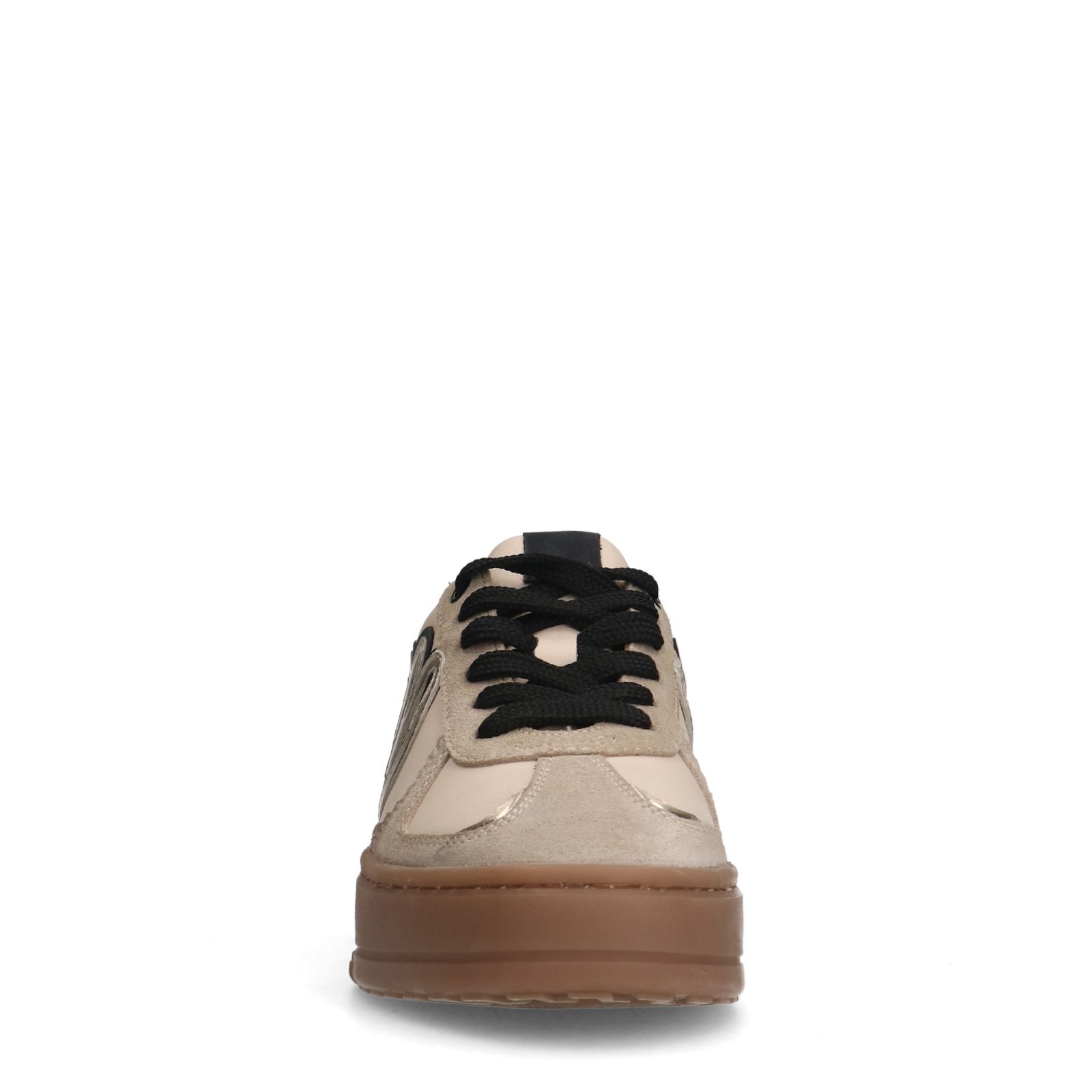 Beige leren sneakers met gouden details van Manfield. De sneakers hebben een dikke zool van 4 cm en een uitneembare binnenzool. We adviseren als verzorging en bescherming de Collonil Carbon Pro.
