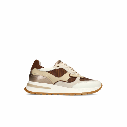 Beige leren sneakers met multicolor details van Manfield. De sneakers hebben een witte zool van 3 cm. We adviseren als bescherming en verzorging de Collonil Carbon pro.