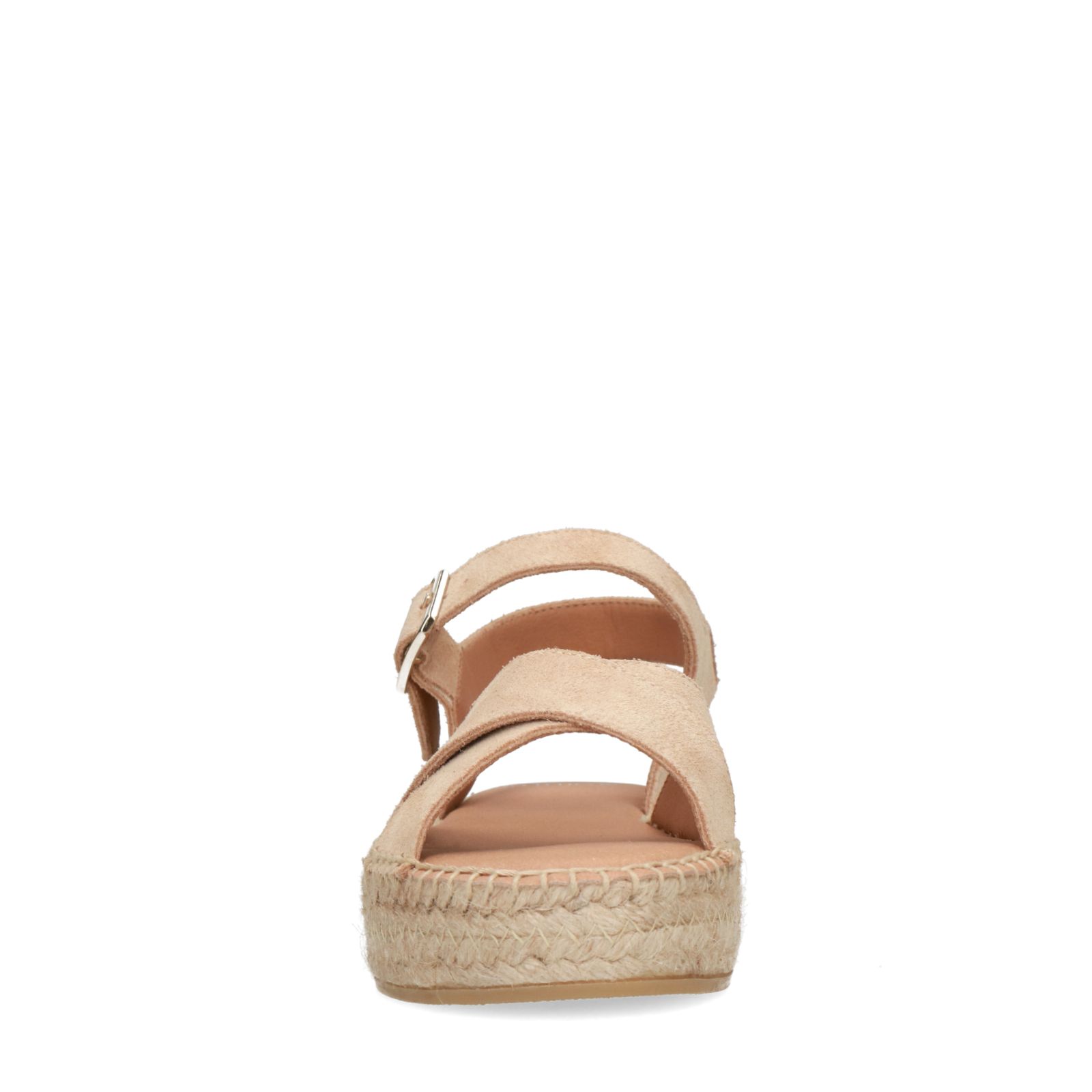 Beige suède sandalen van Manfield met plateauzool van 2,5 cm en gespsluiting rondom de enkel. We adviseren als verzorging en bescherming de suède/nubuck spray in transparant.