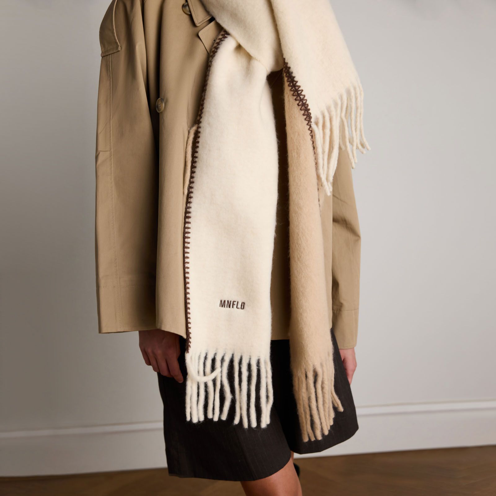 Beige sjaal met beige en bruine details van Manfield en is gemaakt van 100% polyester. De sjaal heeft twee verschillende lengtes, totale lengte van 240 cm en een tussenlengte van 160 cm. De sjaal heeft een breedte van 42 cm.