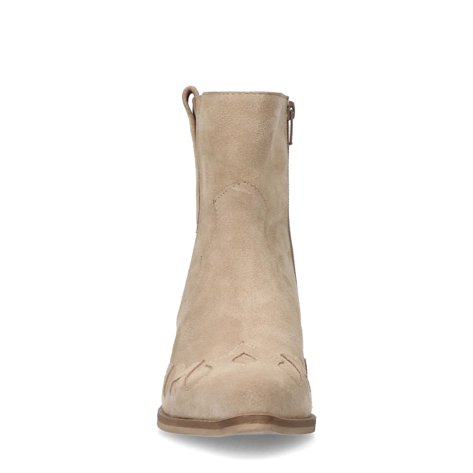 Beige suède cowboylaarzen van Manfield, met een blokhak van 5 cm. We adviseren als verzorging en bescherming de suède/nubuck spray in transparant.