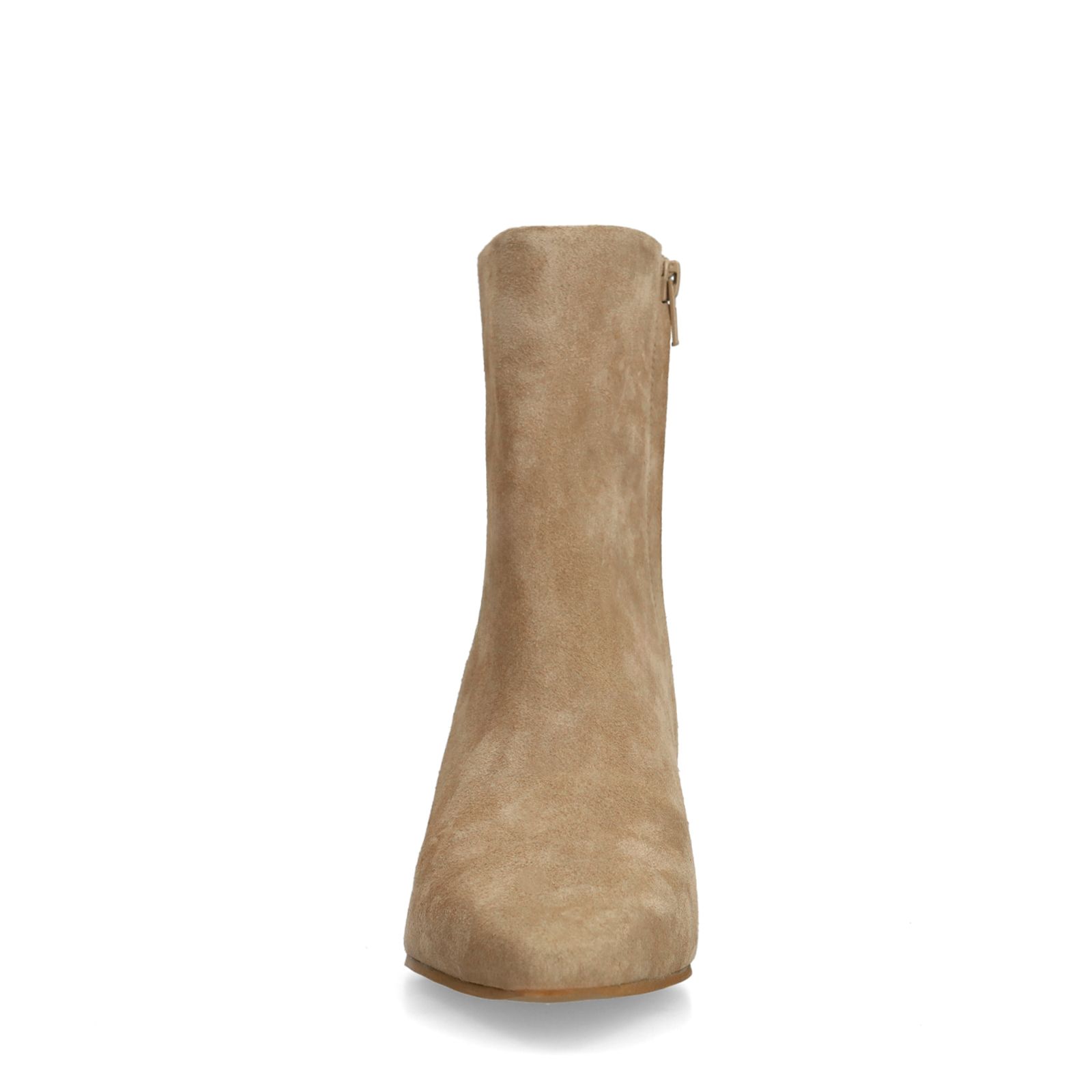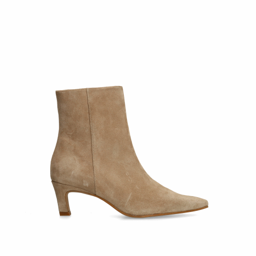 Beige suède enkellaarsjes met hak van Manfield. De enkellaarsjes hebben een puntige neus, rits aan de binnenzijde en hak van 6 cm. We adviseren als verzorging en bescherming de suède/nubuck spray in transparant.