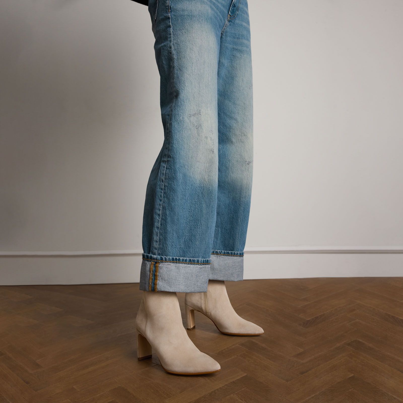 Beige suède enkellaarsjes met hak van Manfield. De enkellaarsjes hebben een hak van 8 cm, een puntige neus en een ritssluiting aan de binnenzijde. We adviseren als bescherming en verzorging de Collonil Carbon pro.