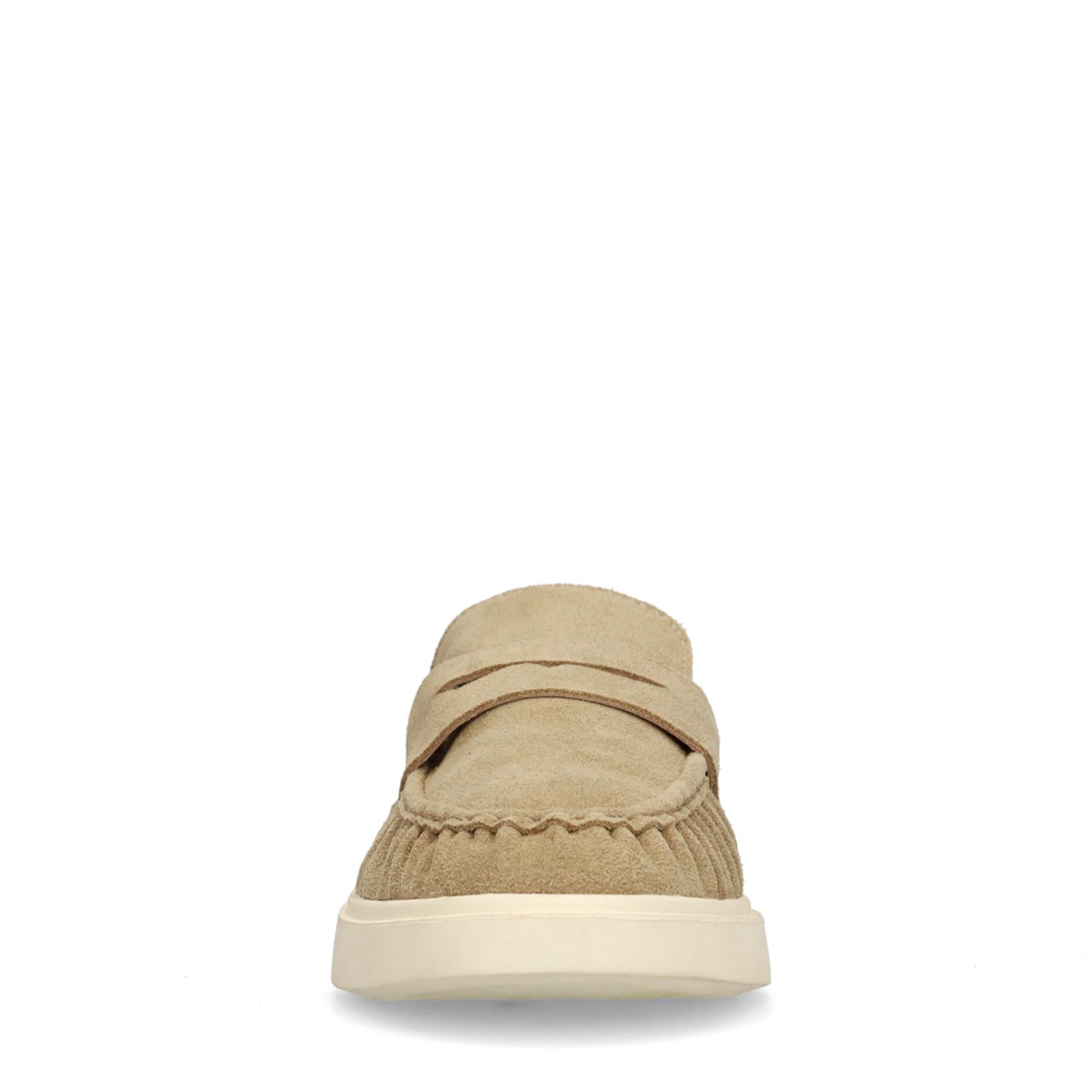 Beige suède loafers van Manfield met een zool van 3 cm, stiksel details en ronde neus. De binnenzool is uitneembaar en we adviseren als verzorging en bescherming de suède/nubuck spray in transparant.