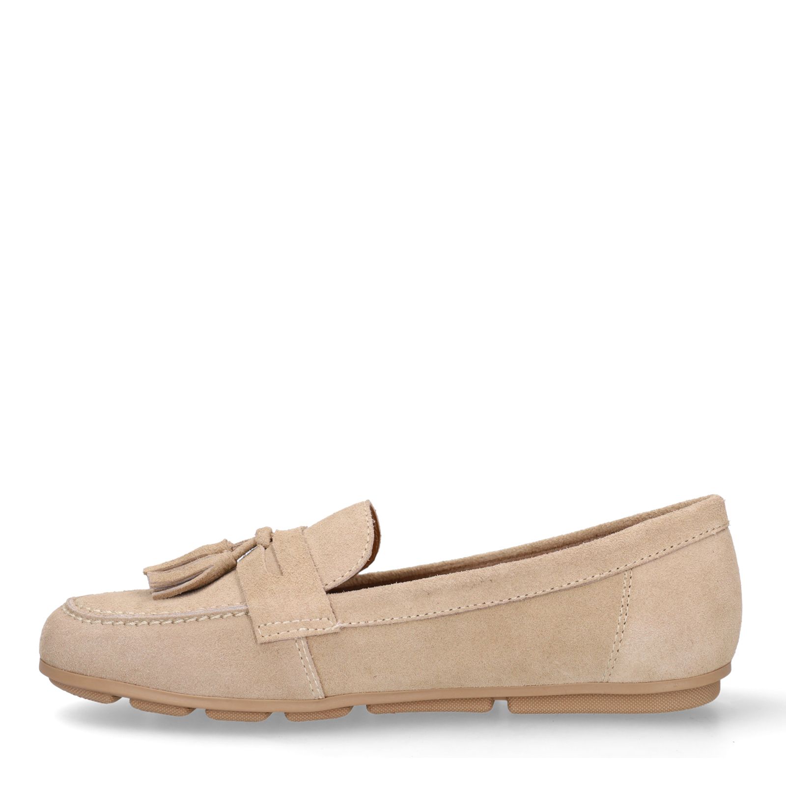 Beige suède loafers met franjes