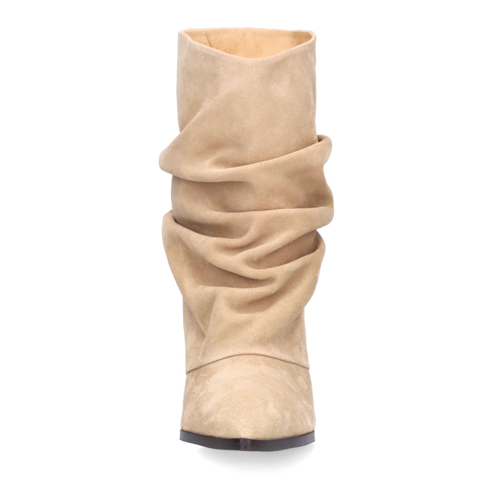 Beige suède slouchy enkellaarsjes met hak van Manfield. De enkellaarsjes hebben een smalle hak van 6 cm, een puntige neus en een afzak design. We adviseren als bescherming en verzorging de suède/ nubuck spray in transparant.