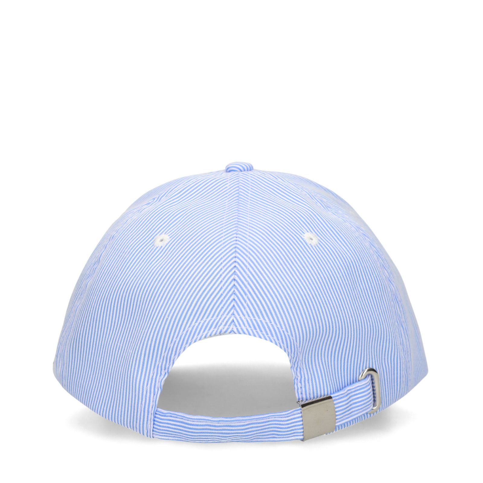 Blauw en witte gestreepte pet van Manfield. De pet is verstelbaar en heeft een diameter van 21 cm.