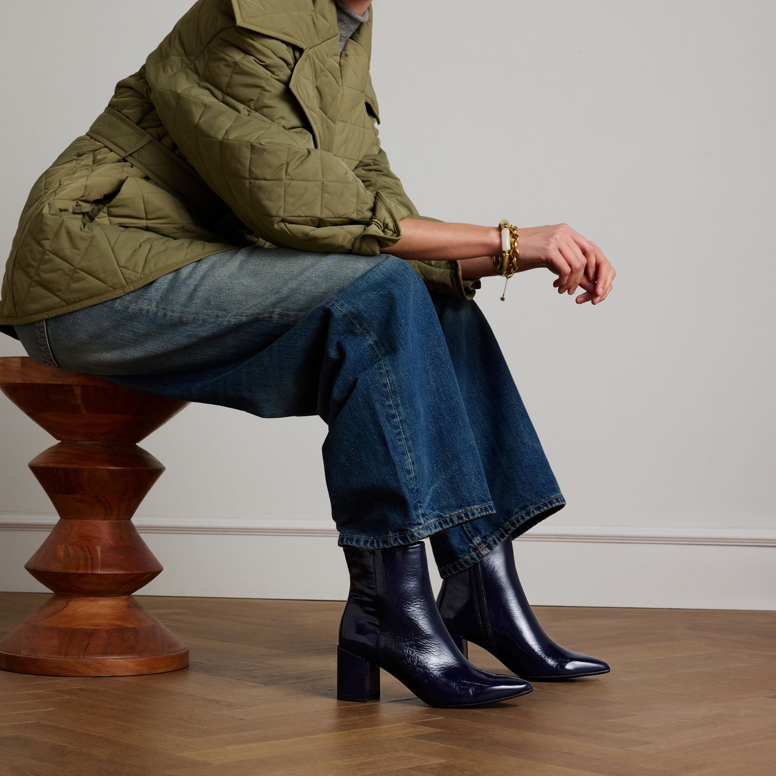 Blauwe lakleren enkellaarsjes met hak van Manfield. De enkellaarsjes hebben een puntige neus, blokhak van 7 cm en een ritssluiting aan de binnenzijde. We adviseren als bescherming en verzorging de Collonil Carbon Pro.