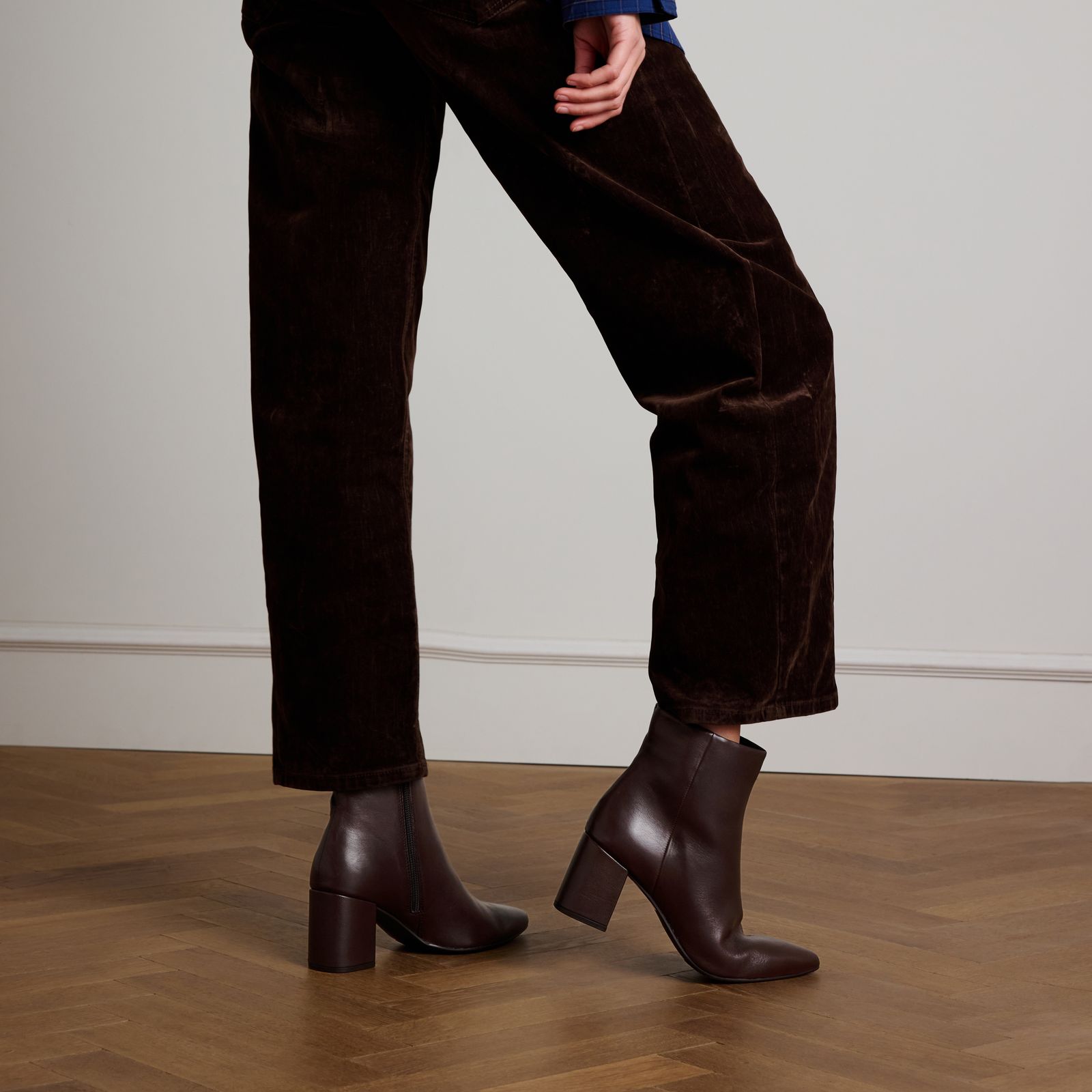 Bruine leren enkellaarsjes met hak van Manfield. De laarsjes hebben een blokhak van 7 cm, een puntige neus en een ritssluiting aan de binnenzijde. We adviseren als bescherming en verzorging de Collonil Carbon pro.