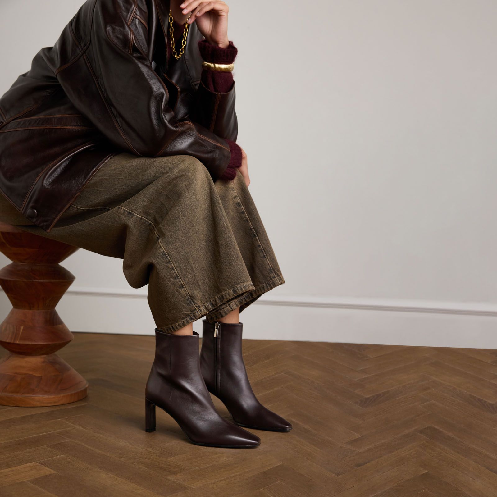 Bruine leren enkellaarsjes met hak van Manfield. De enkellaarsjes hebben een hak van 7 cm, een schachthoogte van 16 cm, een schachtbreedte van 27 cm, en een ritsluiting. Als bescherming en verzorging adviseren wij de Collonil Carbon pro.