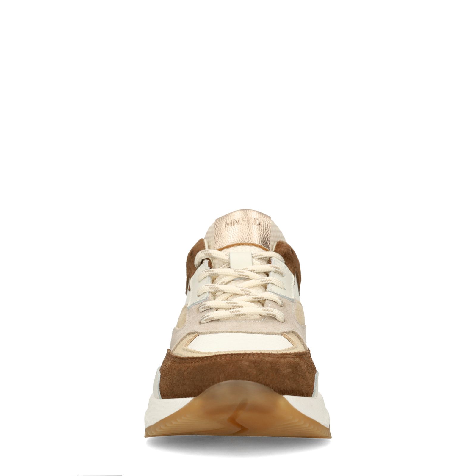 Bruine leren sneakers van Manfield met bruine en beige details. De sneakers hebben een grijs met witte vetersluiting en een witte plateauzool van 4 cm. We adviseren als verzorging en bescherming de Collonil Carbon Pro.