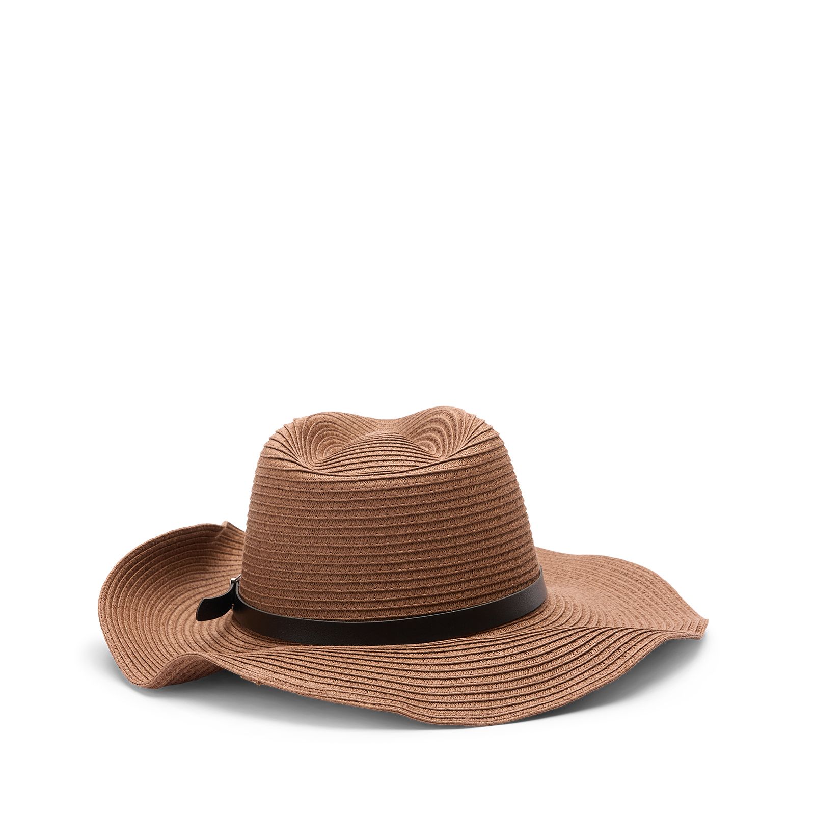 Bruine strandhoed van Manfield met een zwart bandje, aantrek touwtjes en een effect door heel de hoed.