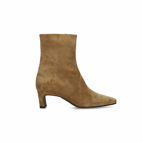 Bruine suède enkellaarsjes met hak van Manfield. De laarsjes hebben een ritssluiting aan de zijkant, een puntige neus en een hak van 4 cm. De schachthoogte bedraagt 17 cm, en de schachtomtrek 26 cm, gemeten bij een maat 37. We adviseren als verzorging en bescherming de Natural Trendspray.