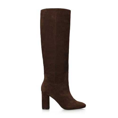 Bruine suède hoge laarzen met hak van Manfield. De laarzen hebben een ronde neus en een blokhak van 8.5 cm. De schachthoogte is 41 cm en de schachtomtrek bedraagt 40 cm, gemeten bij een maat 37. We adviseren als verzorging en bescherming suède/nubuck spray in transparant.