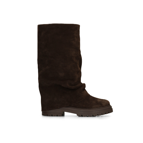 Bruine suède laarzen met flap van Manfield met een rits aan de binnenzijde. De laarzen hebben een schachthoogte van 34 cm en een schachtbreedte van 45 cm, gemeten bij een maat 37. We adviseren als verzorging en bescherming de suède/nubuck spray in transparant.