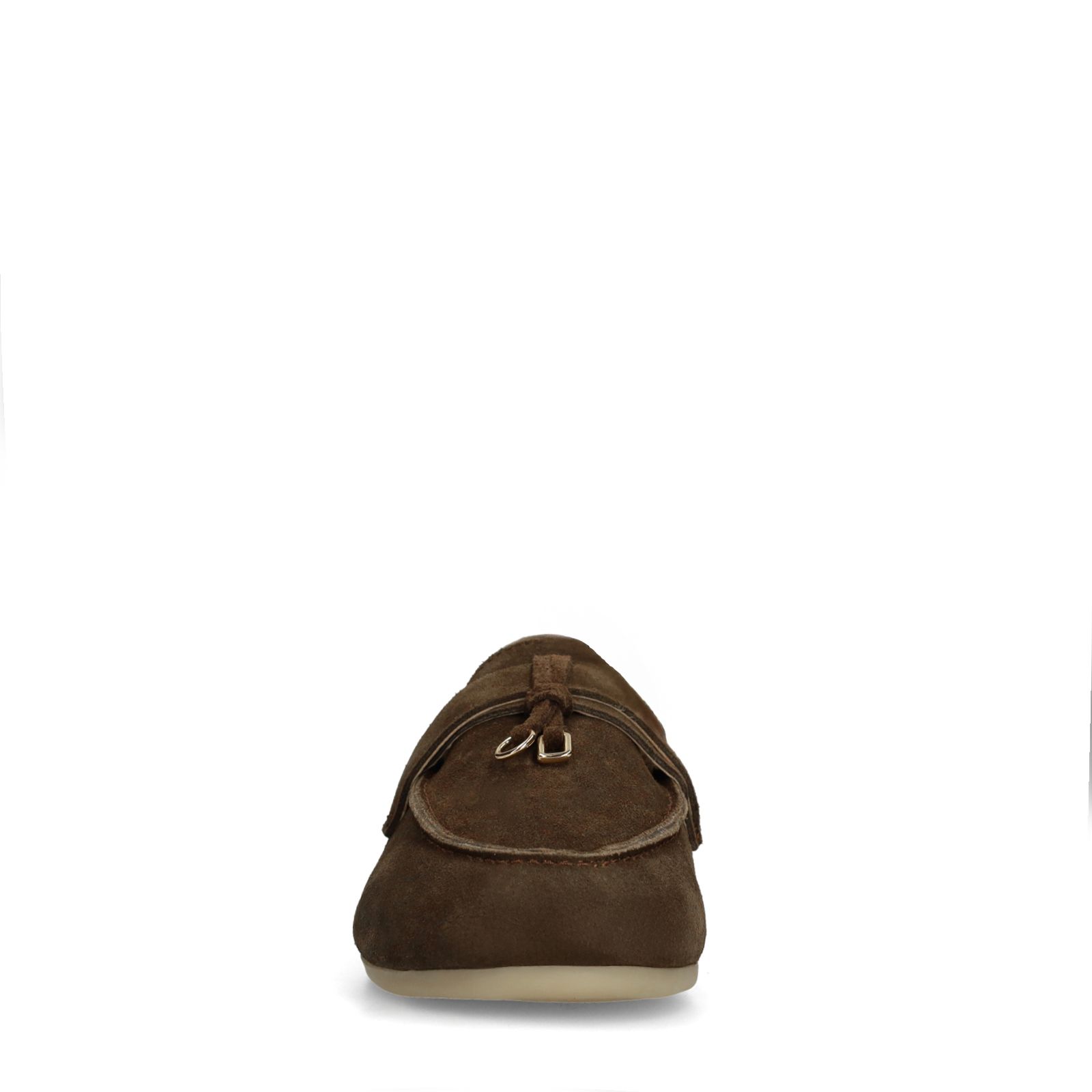 Bruine suède loafers van Manfield met goudkleurige details op de voorvoet. De loafers hebben een rubberen zool van 1 cm. We adviseren als verzorging en bescherming de suède/nubuck spray in transparant.