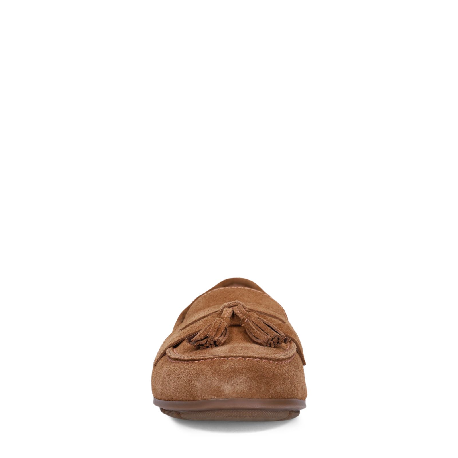 Bruine suède loafer met franjes van Manfield. De loafers hebben een gestikte ronde neus. We adviseren als verzorging en bescherming de Natural Trendspray.