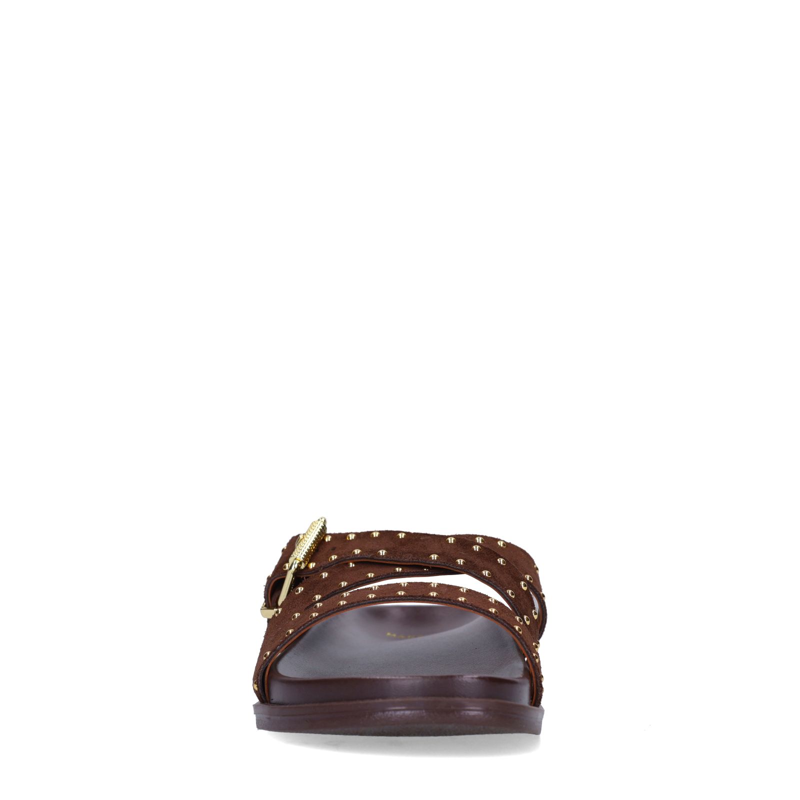 Bruine suède slippers met studs van Manfield. De slippers hebben een plateauzool van 3 cm, gekruiste banden en gespsluiting die over de voorvoet lopen. We adviseren als verzorging en bescherming de suède/nubuck spray in transparant.