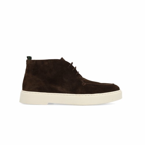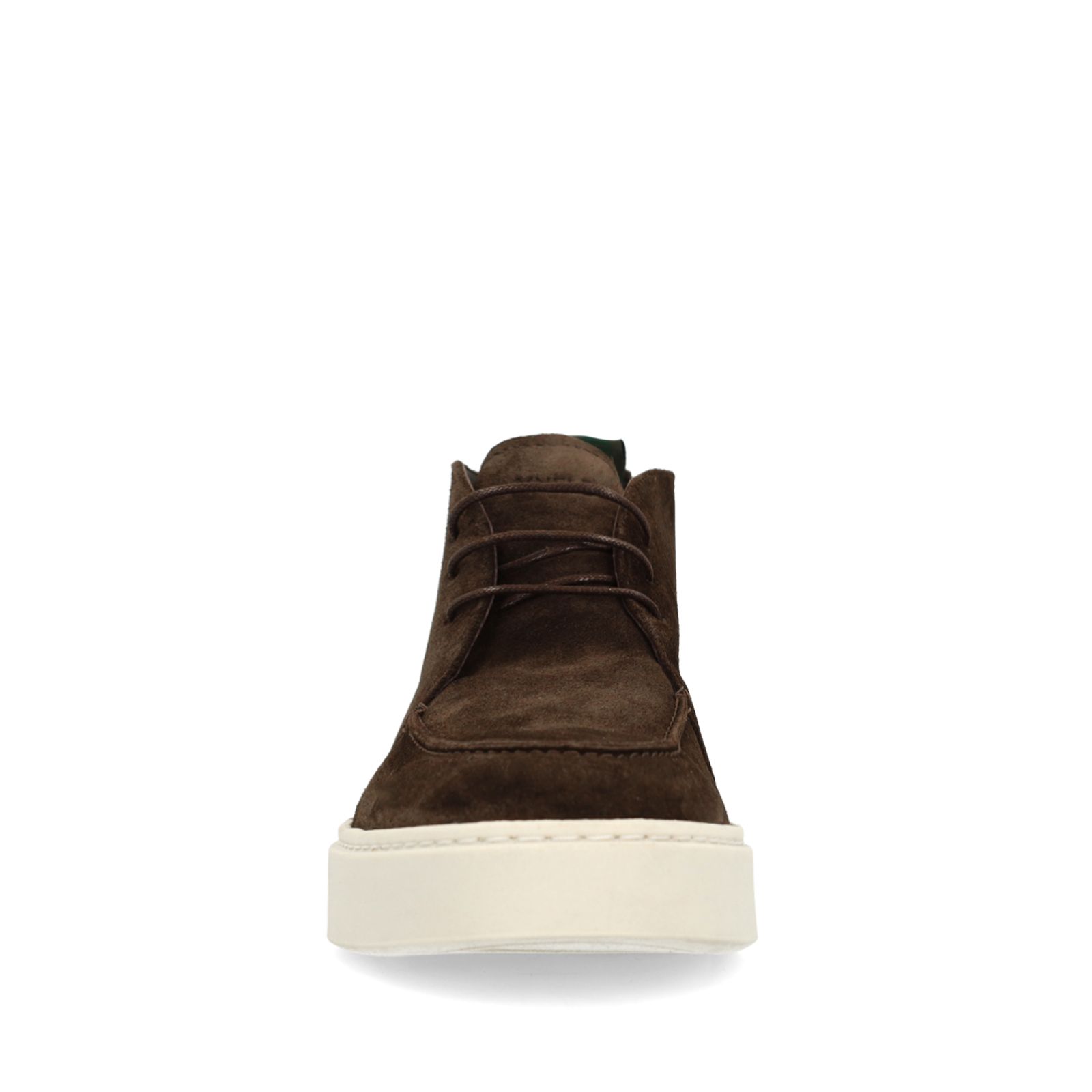 Bruine suède veterboots van Manfield met een witte zool van 3 cm. We adviseren als verzorging en bescherming de suède/ nubuck spray in transparant.
