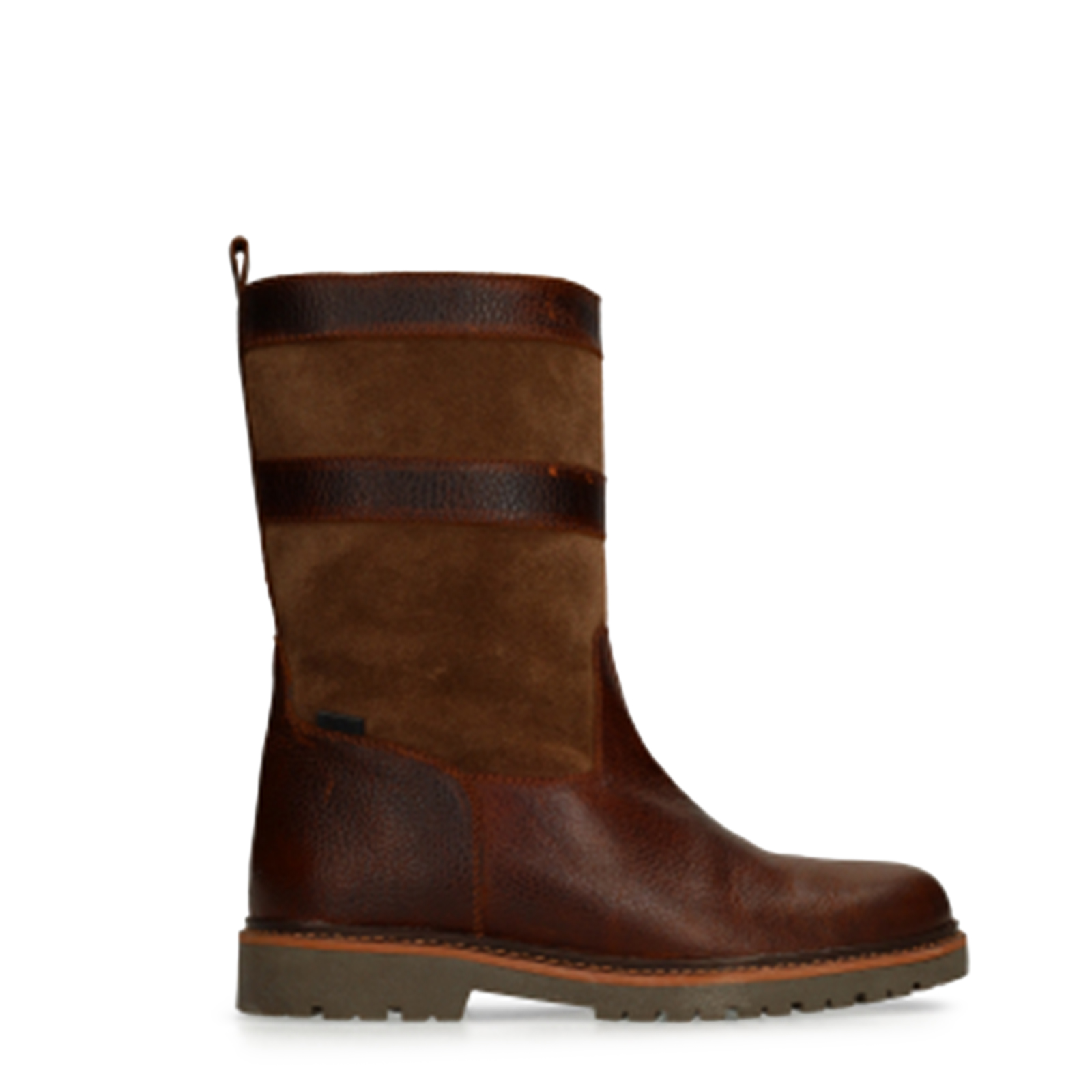 Cognac leren boots van Manfield. De buitenkant is gemaakt van leer en de binnenkant van bont. De laarzen hebben een ritssluiting aan de zijkant, ronde neus en een hak van 3 cm. De schachthoogte is 20 cm en de schachtomtrek is 38 cm, We adviseren als verzorging en bescherming de Collonil Carbon Pro.