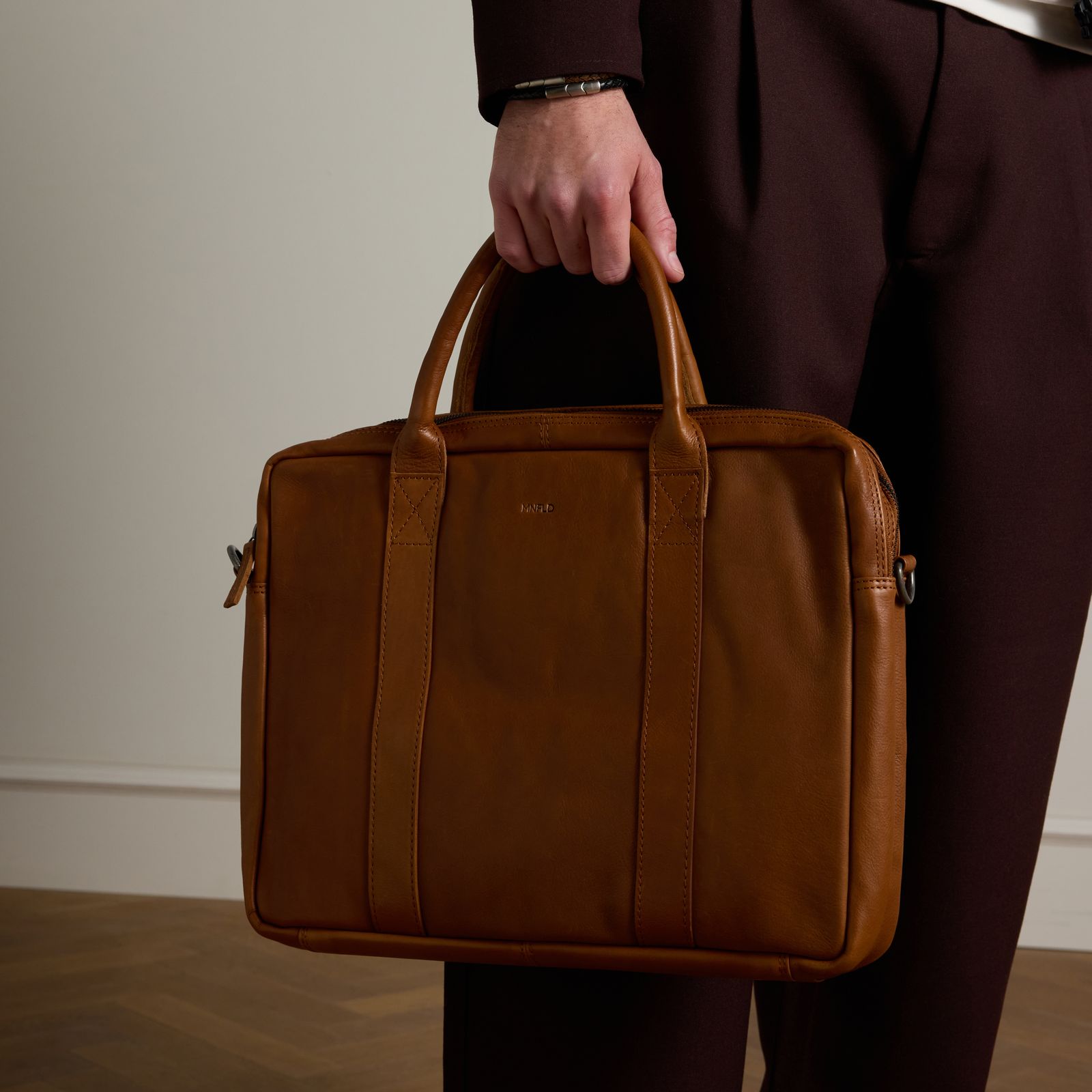 Cognac leren laptoptas van Manfield. De tas heeft twee grote rits zakken en een zijsluiting. De afmeting van de tas is 44x35x9 cm, (BxHxD). In de tas past een 18 inch laptop en heeft een verstelbare schouderband met een totale lengte van 150 cm.