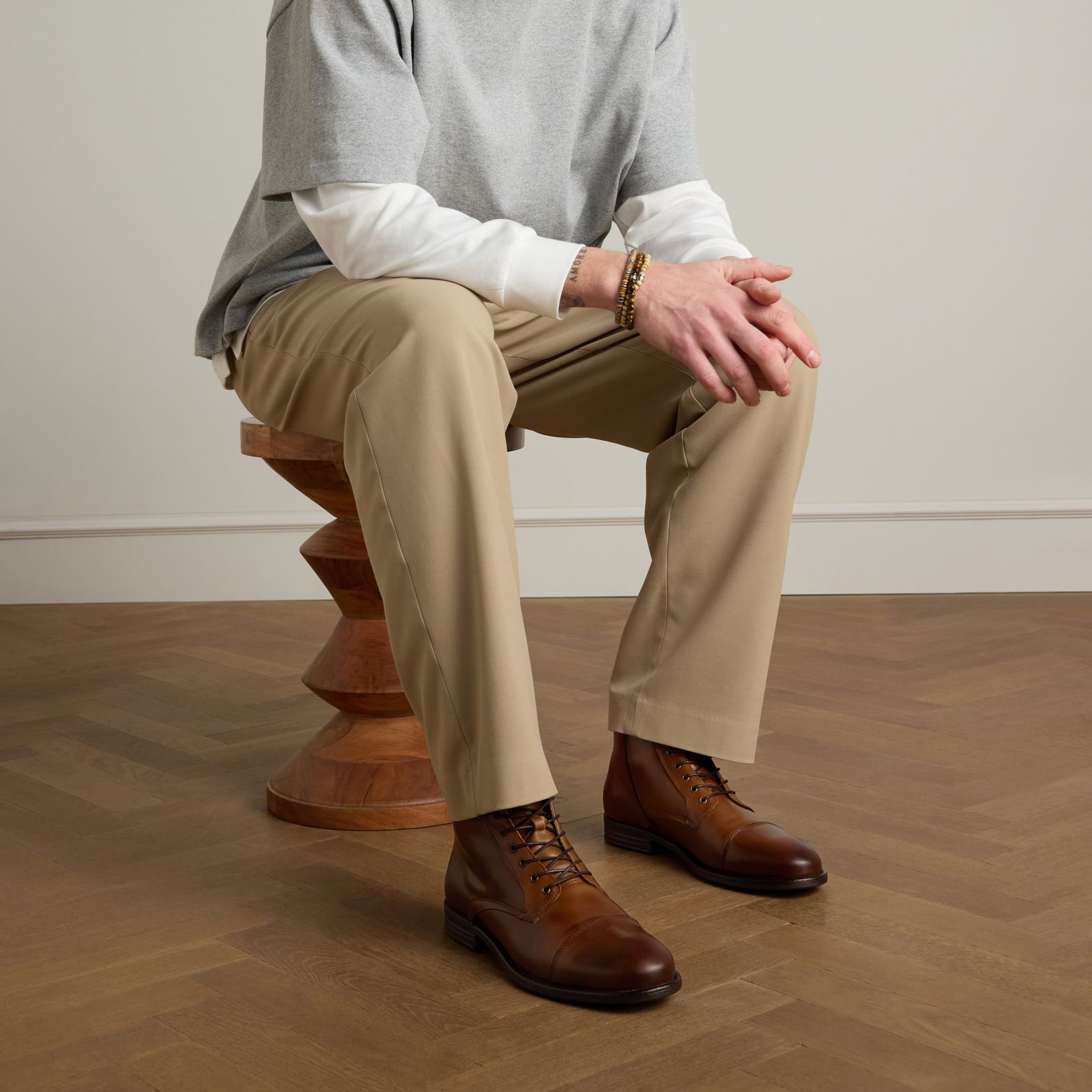 Cognac leren veterboots van Manfield met een hoge vetersluiting en platte hak van 2 cm. We adviseren als verzorging en bescherming de Collonil Carbon Pro.
