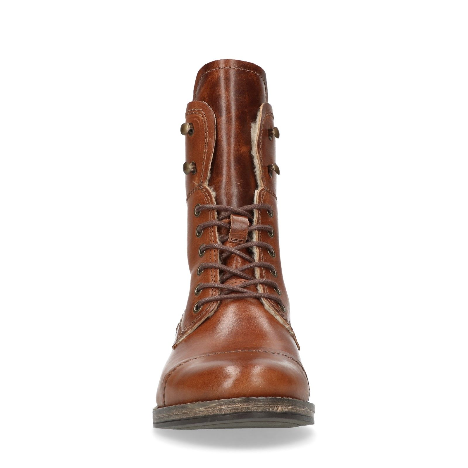 Cognac leren veterlaarsjes van Manfield. De veterlaarzen hebben een binnenzijde met bonten voering, een buitenzijde van leer ritssluiting aan de zijkant en hak van 3 cm. We adviseren als verzorging en bescherming de Collonil Carbon Pro.