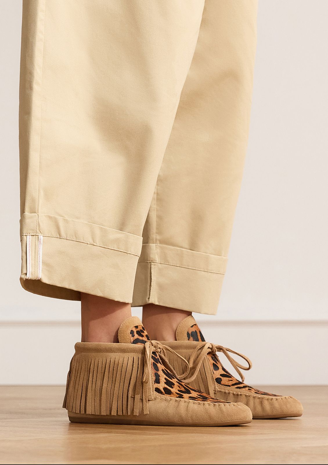 Cognac suède enkellaarsjes met franjes en panter print van Manfield. De franjes op de laarsjes worden dichtgemaakt door middel van een enkele vetersluiting en hebben een platte zool van 1 cm. We adviseren als verzorging en bescherming de suède/nubuck spray in transparant.