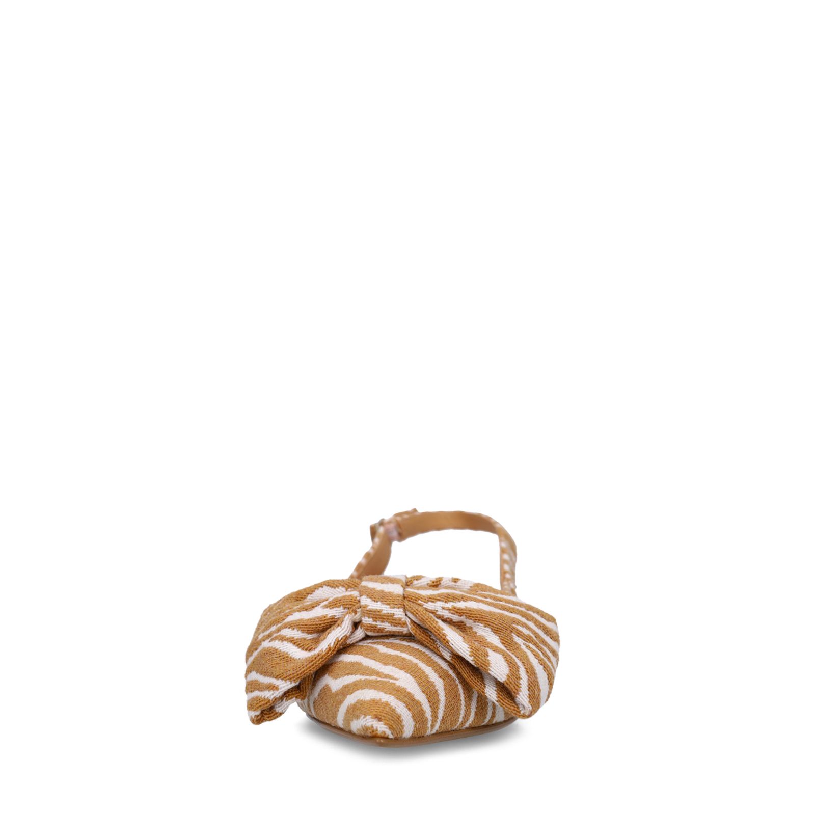 Cognac zebra slingbacks met strik van Manfield. De slingbacks hebben een puntige neus, platte hak van 1 cm en een zilverkleurige gespsluiting. We adviseren als bescherming en verzorging de Collonil Carbon pro.