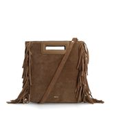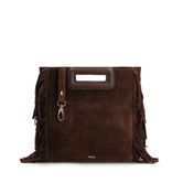 Donkerbruine suède handtas met franjes van Manfield. De tas heeft een afmeting van 21x25x6 cm (BxHxD) en een verstelbare band.