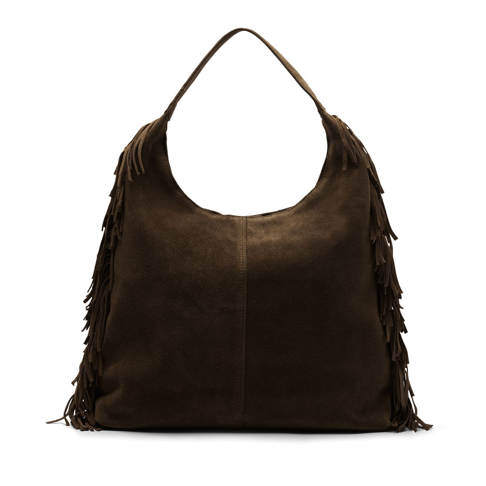 Donkerbruine schoudertas met franjes van Manfield. De tas heeft een drukknoopsluiting en de afmeting is 43x32x13 cm (BxHxD)