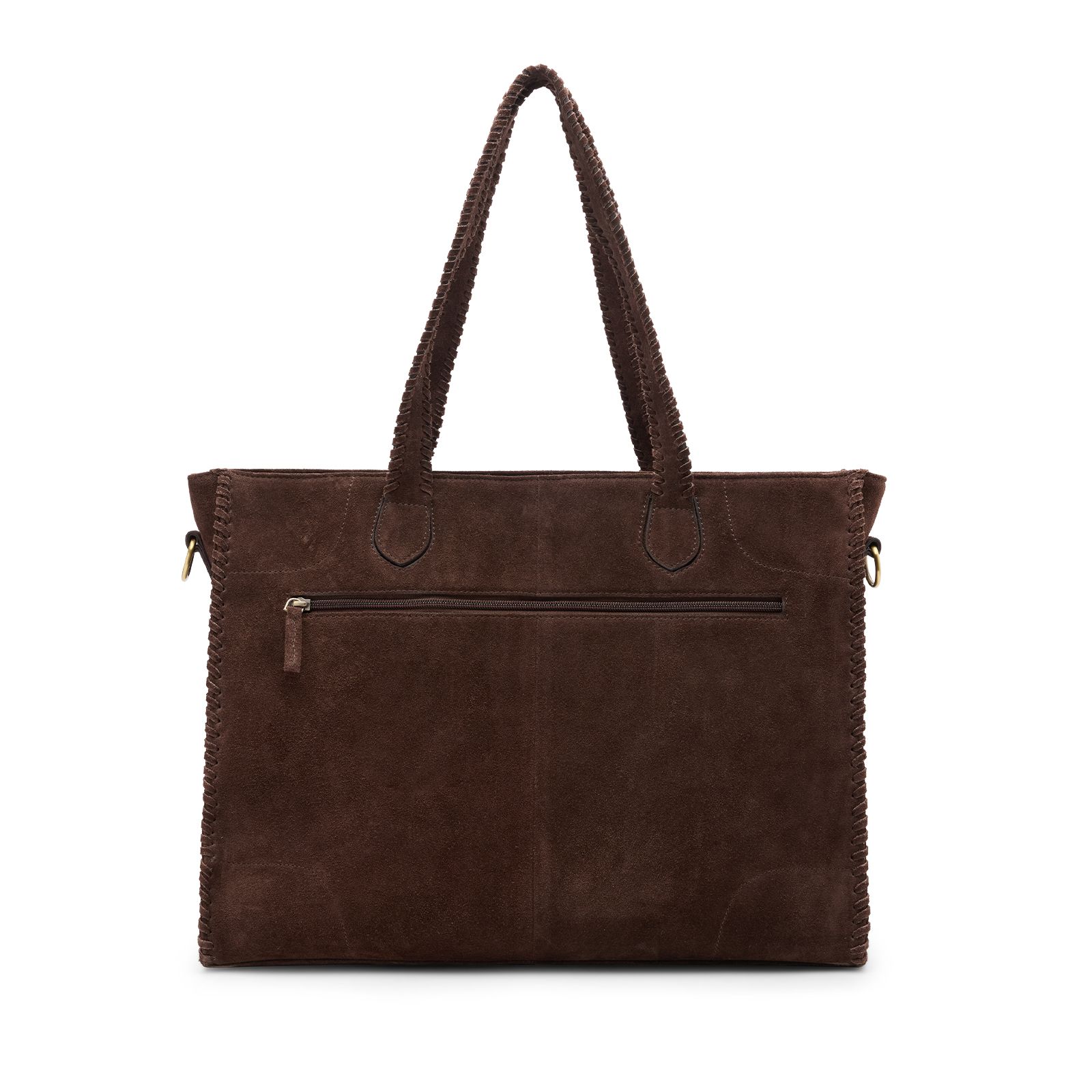 Donkerbruine suède shopper met gevlochten details van Manfield. De shopper heeft een verstelbare band van 145 cm, een ritssluiting en laptop vak.