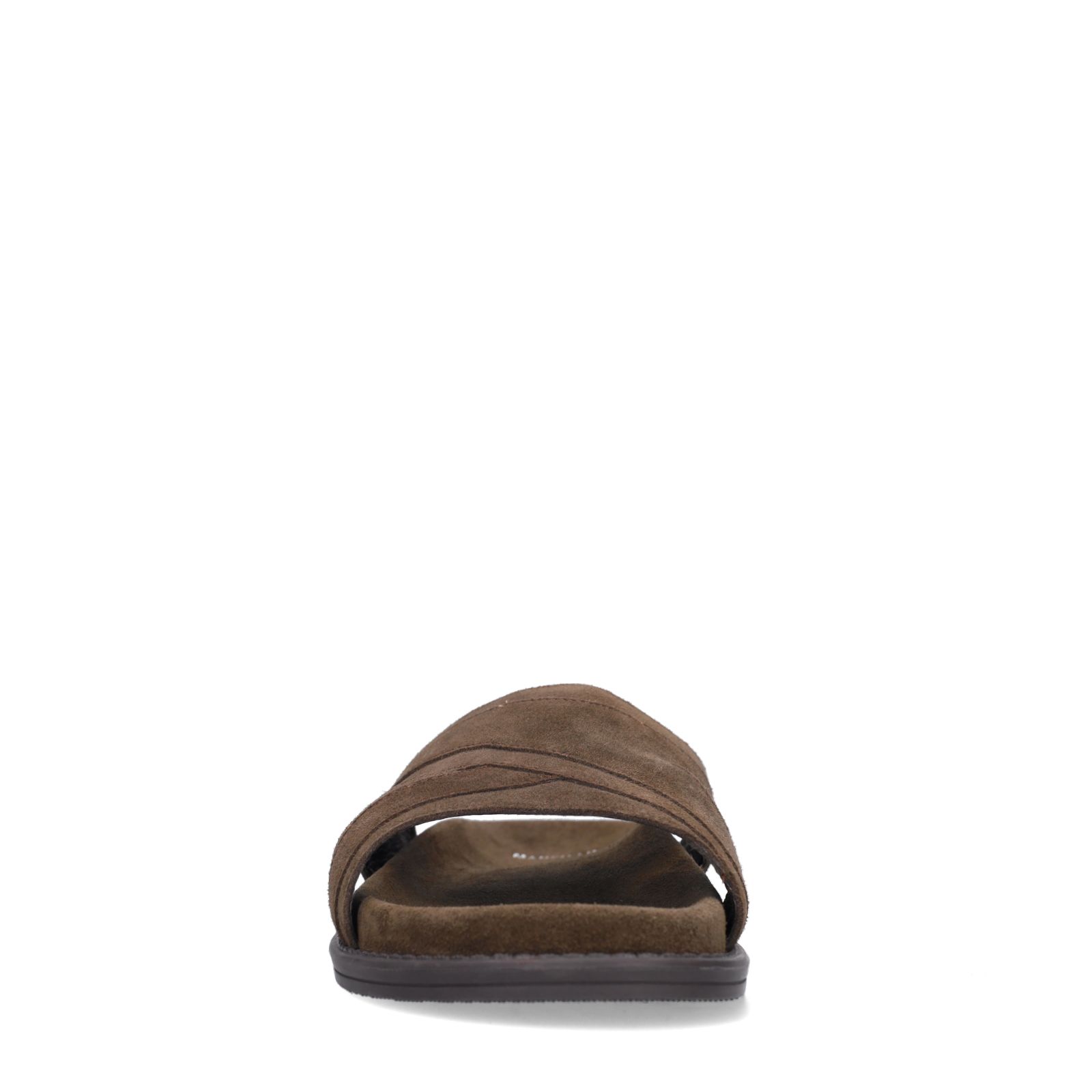Donkerbruine suède slippers van Manfield met een suède zool van 3 cm. De slippers hebben een gekruiste band die over de voorvoet loopt. We adviseren als verzorging de suède/nubuck spray in transparant.