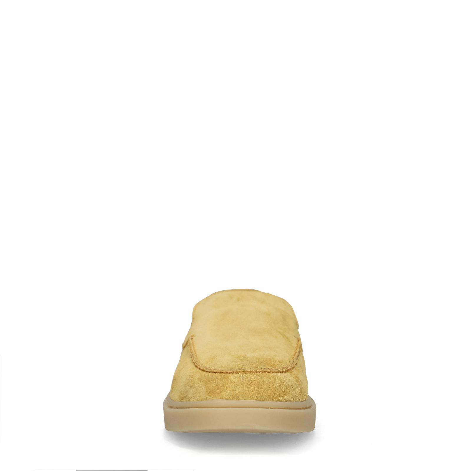 Gele suède loafers van Manfield met een lichte zool van 3 cm. We adviseren als verzorging en bescherming suède/nubuck spray in transparant.