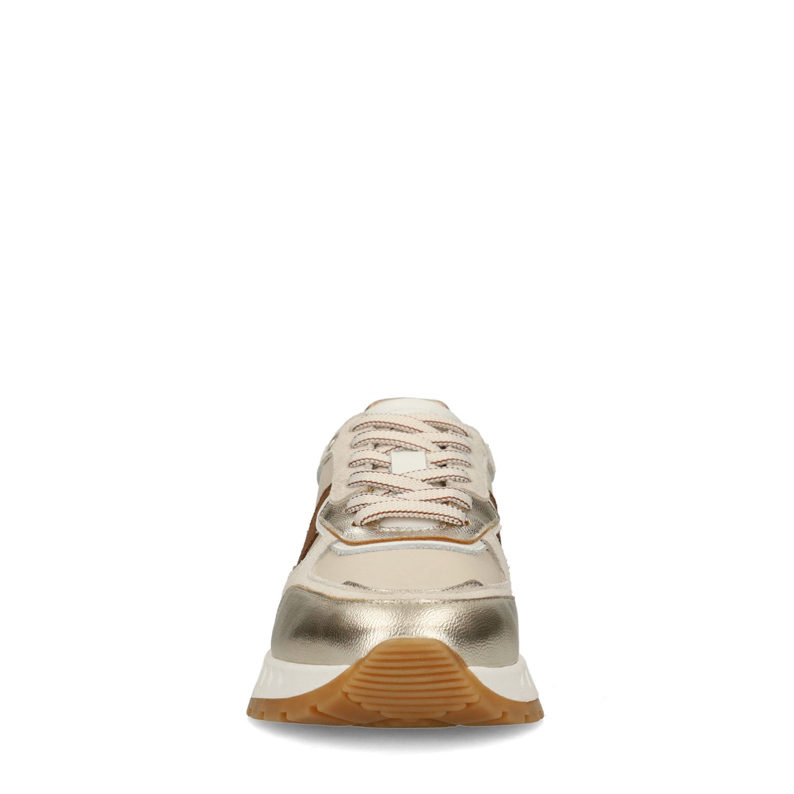 Gouden leren sneakers met multicolor details van Manfield. De sneakers hebben een witte zool van 3 cm. We adviseren als bescherming en verzorging de Collonil Carbon pro.