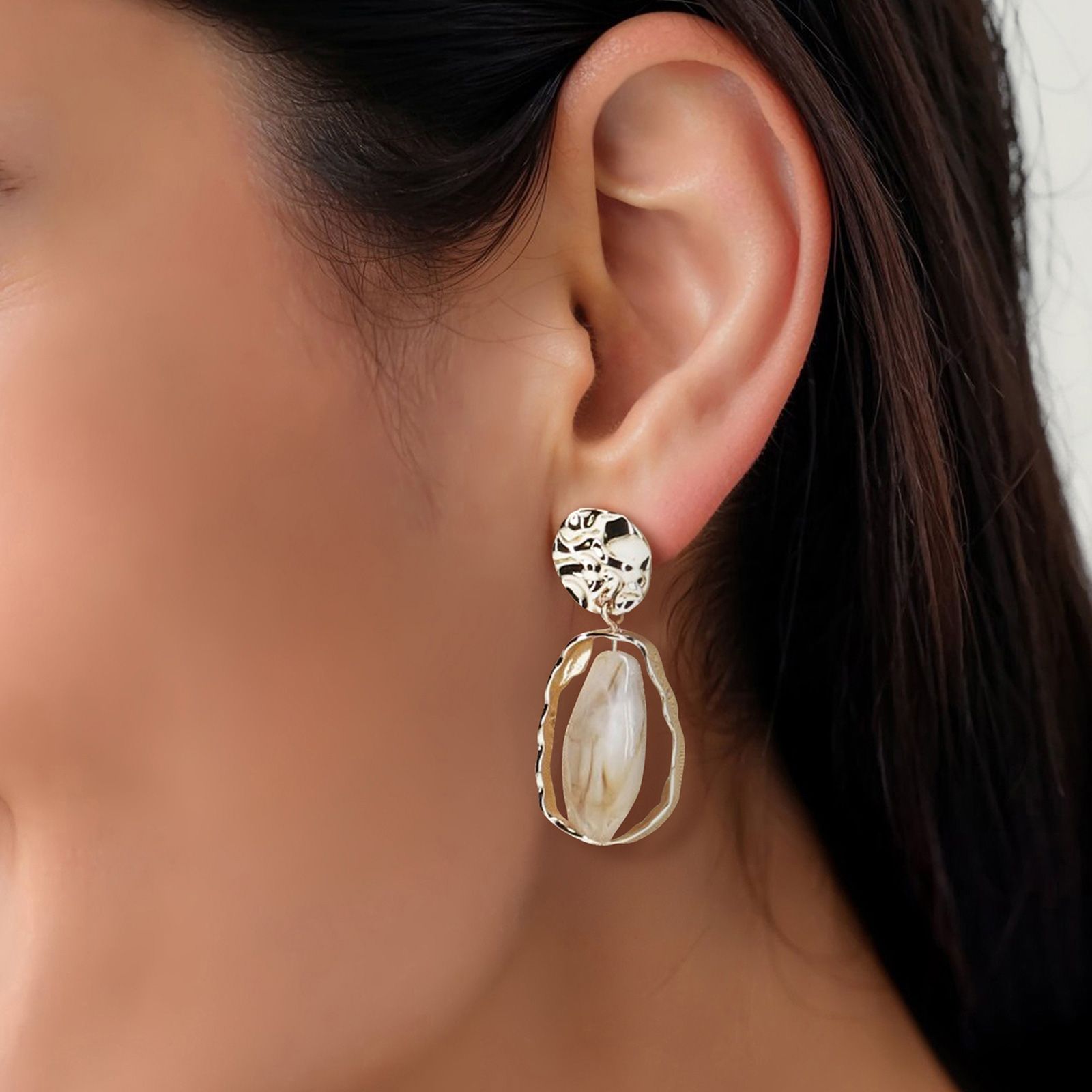 Goudkleurige oorbellen met witte stenen van Manfield, hebben een lengte van 5 cm en een breedte van 2 cm. Wegens de algemene hygiënevoorschriften kan dit artikel niet geretourneerd worden.