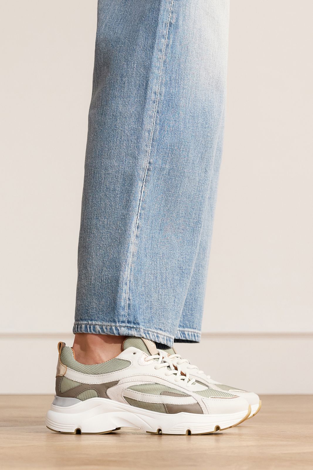 Grijze leren sneakers van Manfield met suède en taupe details, witte vetersluiting en witte plateauzool van 4 cm. We adviseren als verzorging en bescherming de Collonil Carbon Pro.