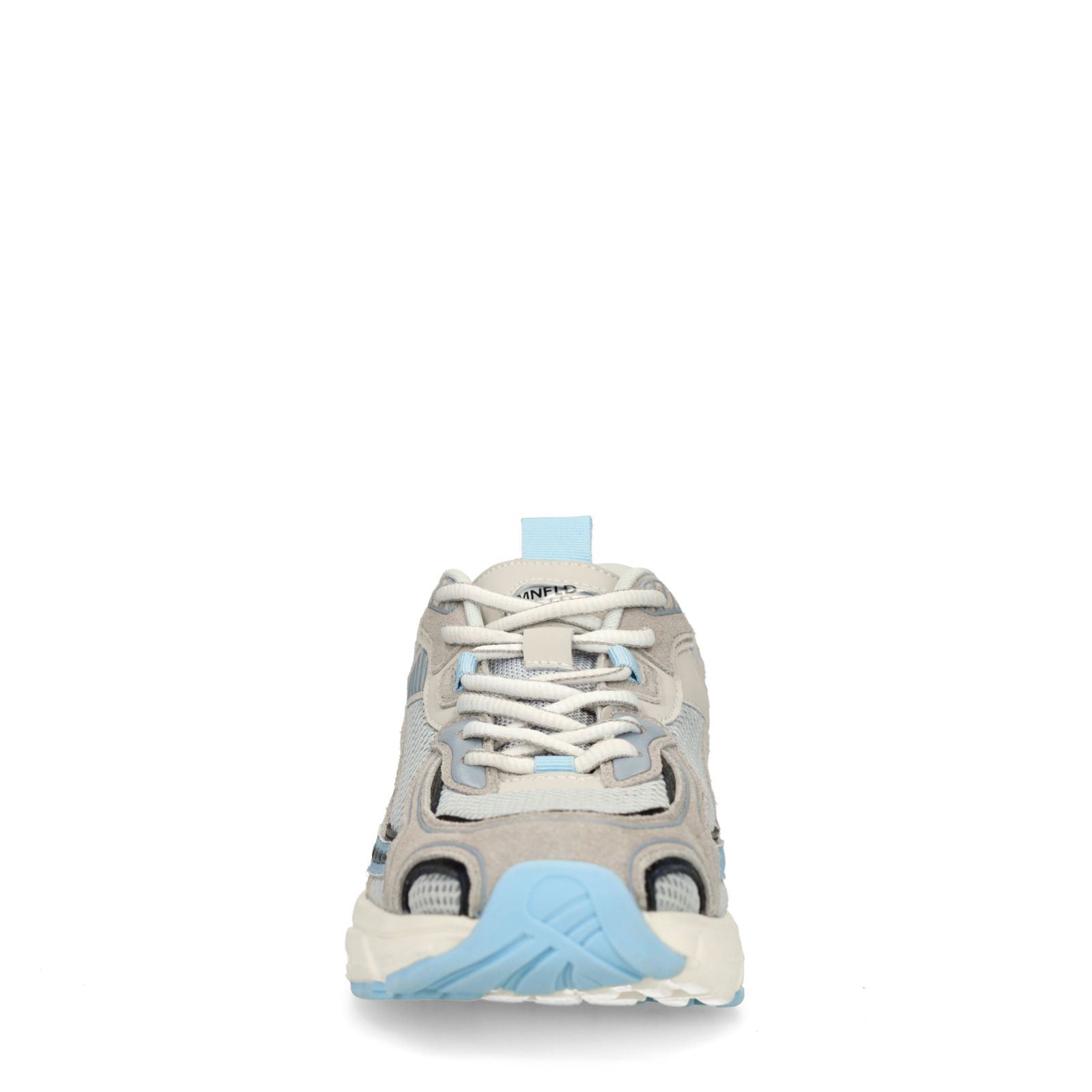 Grijze textiele sneakers met mesh & blauwe details van Manfield en een zool van 4 cm. We adviseren als verzorging en bescherming Collonil Carbon Pro.