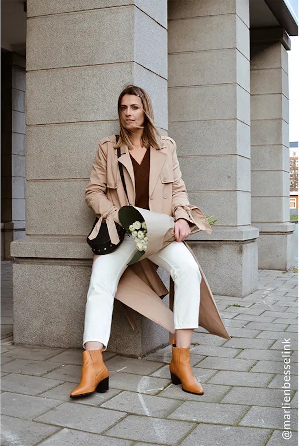 Witte broeken zijn weer helemaal terug in de mode! Zo’n witte broek staat fantastisch met okergele schoenen. Zou houd je je look namelijk nog wel rustig, maar de okergele schoenen (of accessoires) geven de look dan nét iets meer pit.