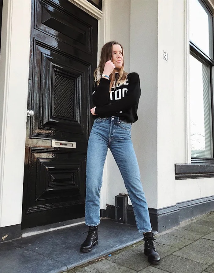 Ga dan voor een lichte denim, losse sweater en zwarte biker boots met gespen of opvallende veters.