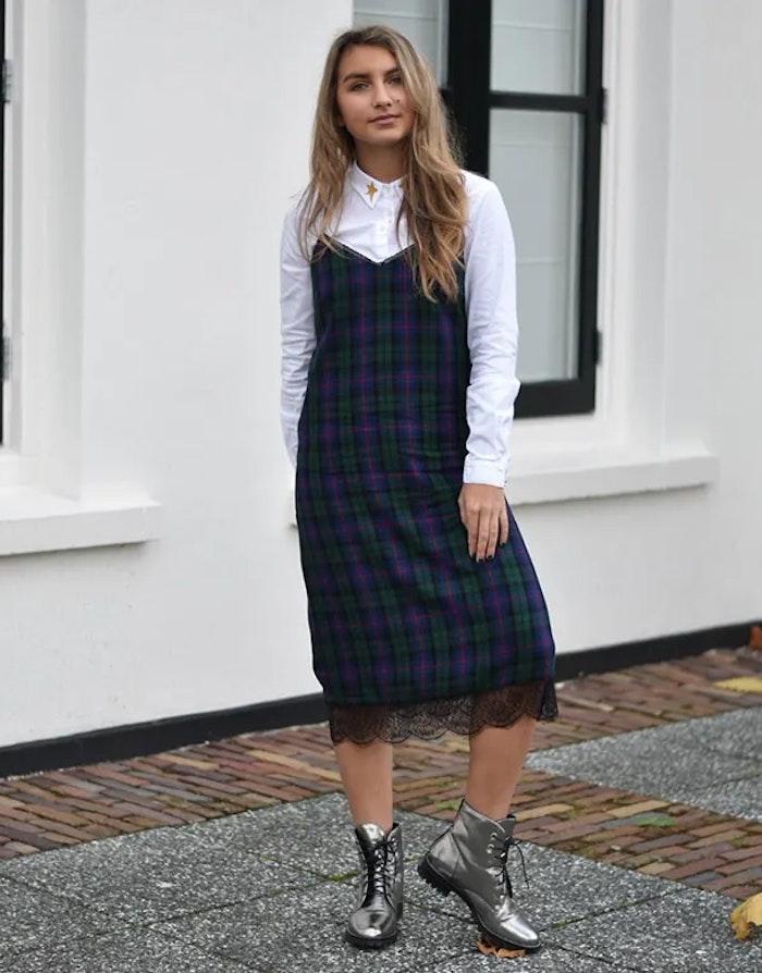 Draag een geruite colbertje, ruiten pantalon of een jurk met ruit patroon met biker boots.