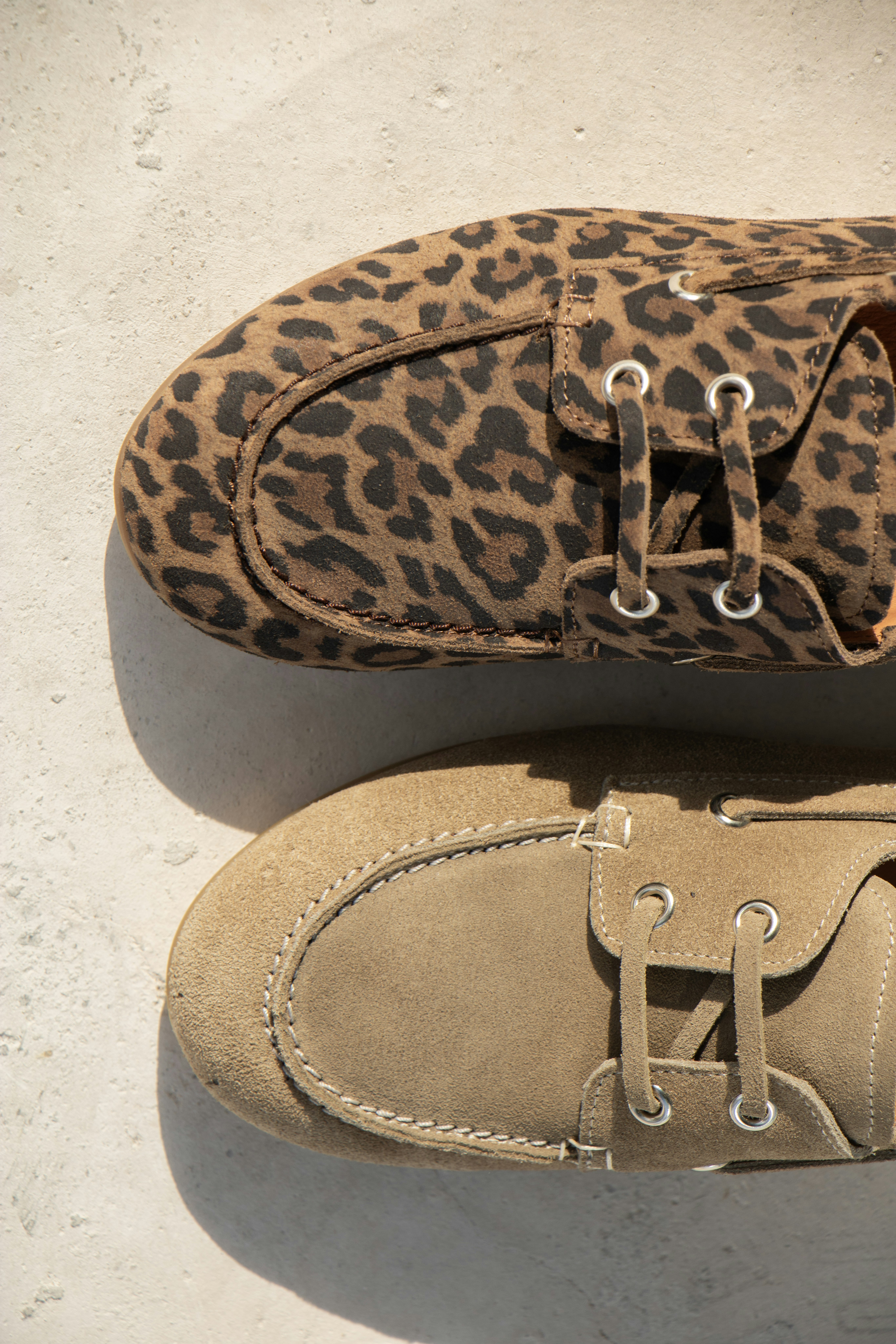 De bootschoen is terug — maar dan met een zomerse twist. Suède maakt deze iconische schoen zachter, lichter en stijlvoller dan ooit. Kies voor zachte natuurtinten als beige, bruin of ga voor een rijke animal print en combineer ze met een linnen broek of bermuda. De perfecte balans tussen casual en chic.