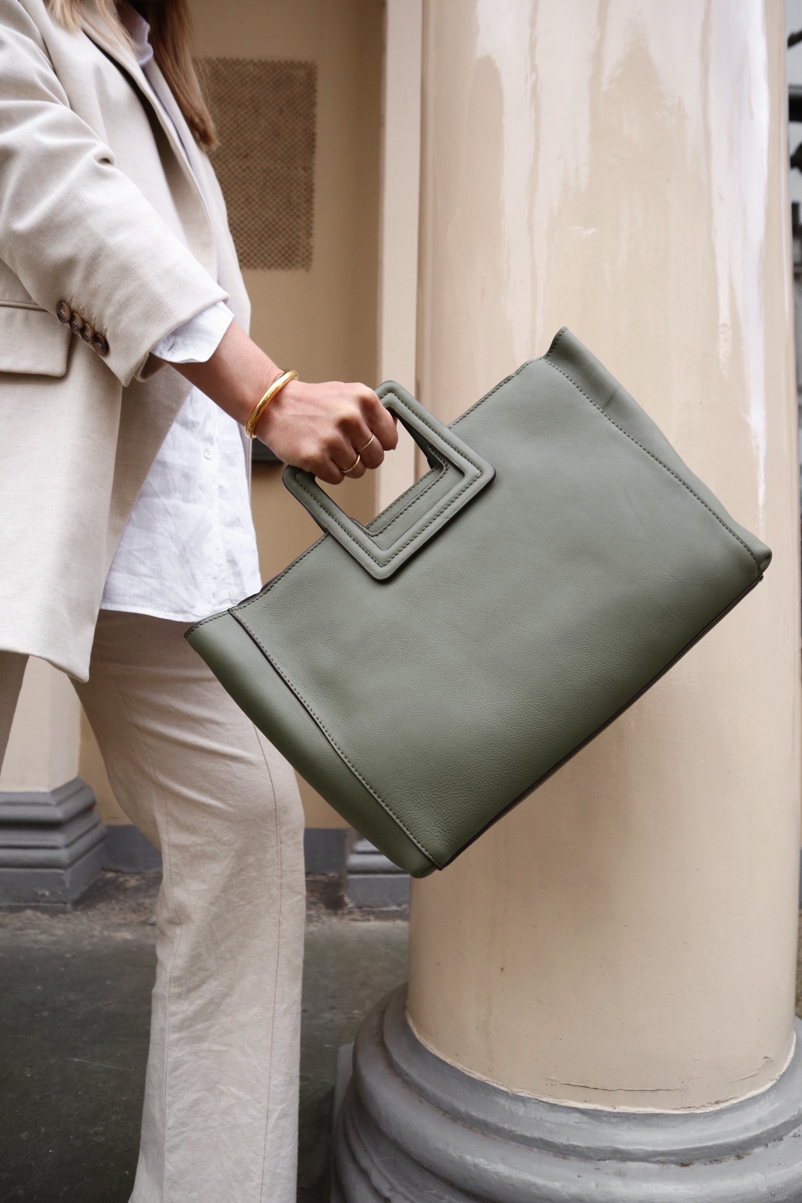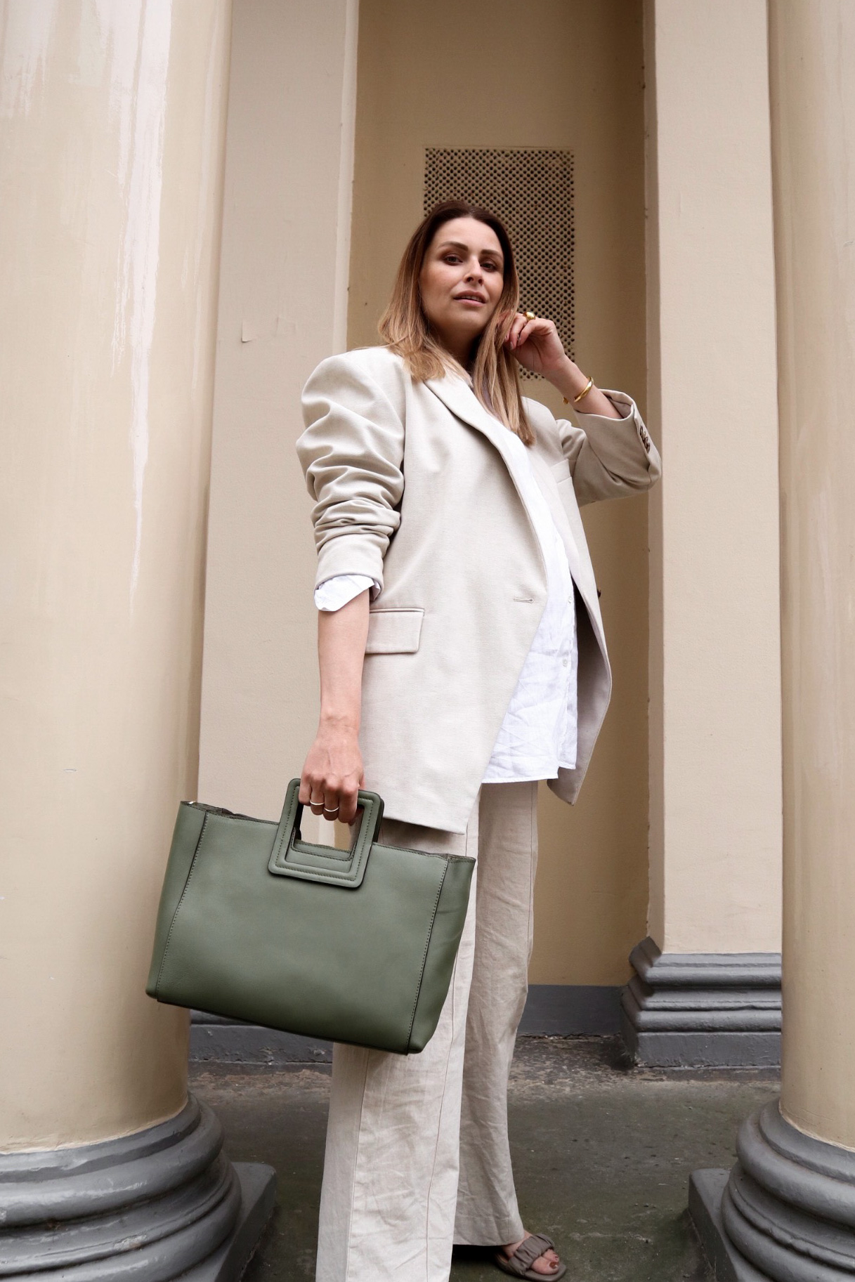 De handtas staat bij Marlien zeker in haar top favorieten. Een handtas is praktisch en stijlvol. De vaak korte band waarmee je de tas kunt dragen zorgt voor een decadente look. Tegenwoordig worden handtassen modern ingezet waardoor de tassen vaak zorgen voor nét dat beetje extra. Marlien draagt haar handtas van Manfield bij een mooi beige pak; een wide leg trouser met een oversized blazer. Ook hier weer kun je de look afstijlen met een van onze zonnebrillen en een stoere sneaker of subtiele sandaal met hak.