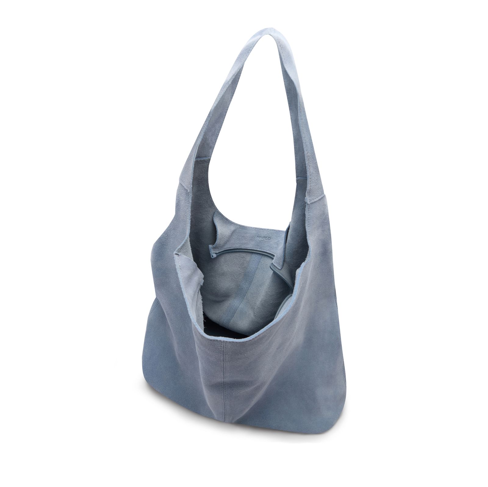 Lichtblauwe suède shopper van Manfield met een ritssluiting. De afmeting van deze tas is 43x32x20 cm (BxHxD). We adviseren als verzorging en bescherming de suède/nubuck spray in transparant.