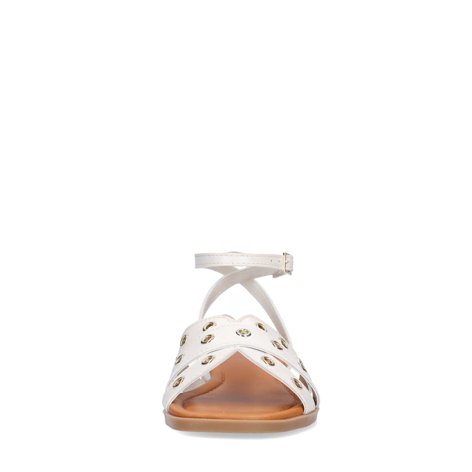 Off White leren sandalen met studs van Manfield. De sandalen hebben een platte zool van 3 cm en gespsluiting rondom de enkel. We adviseren als verzorging en bescherming de Collonil Carbon Pro.