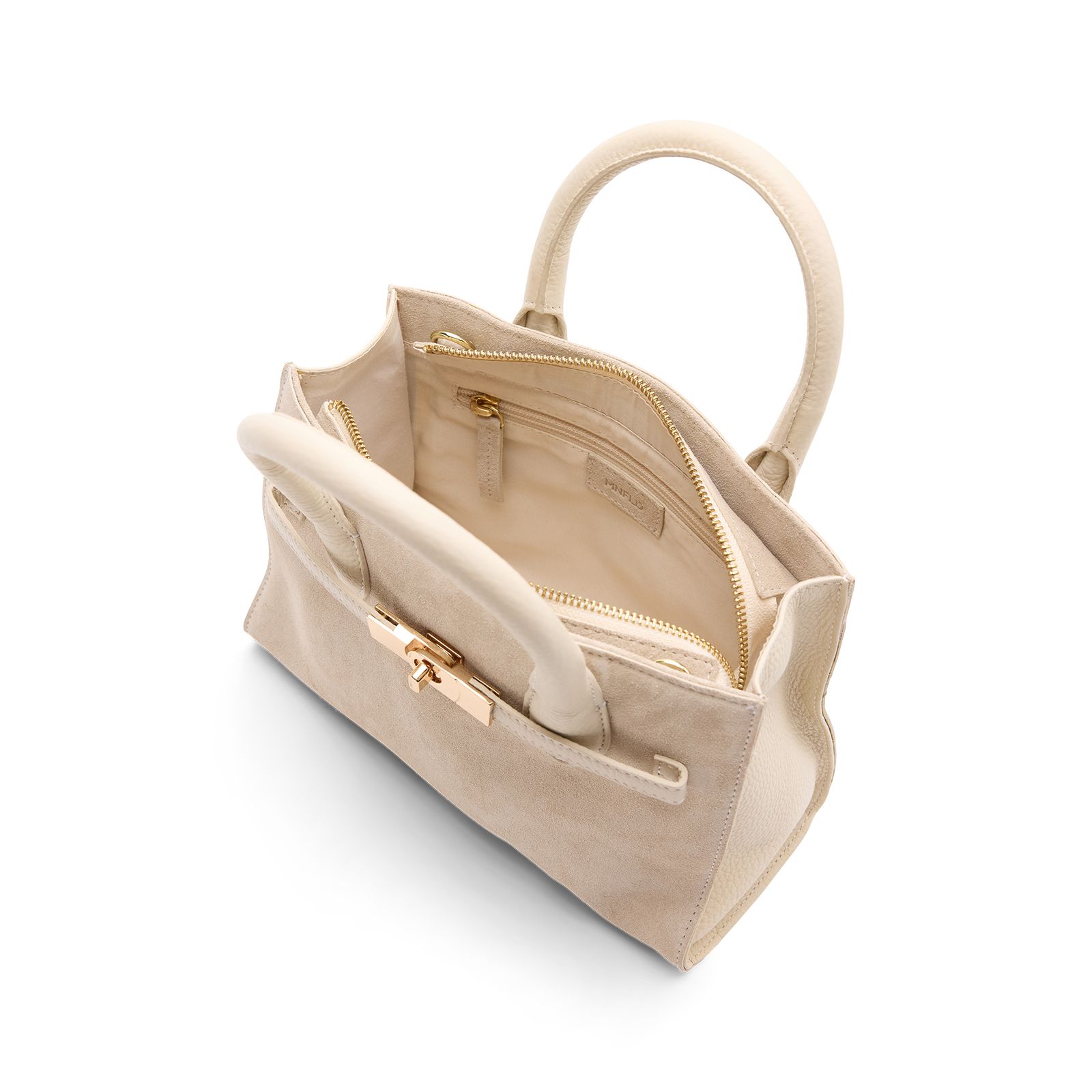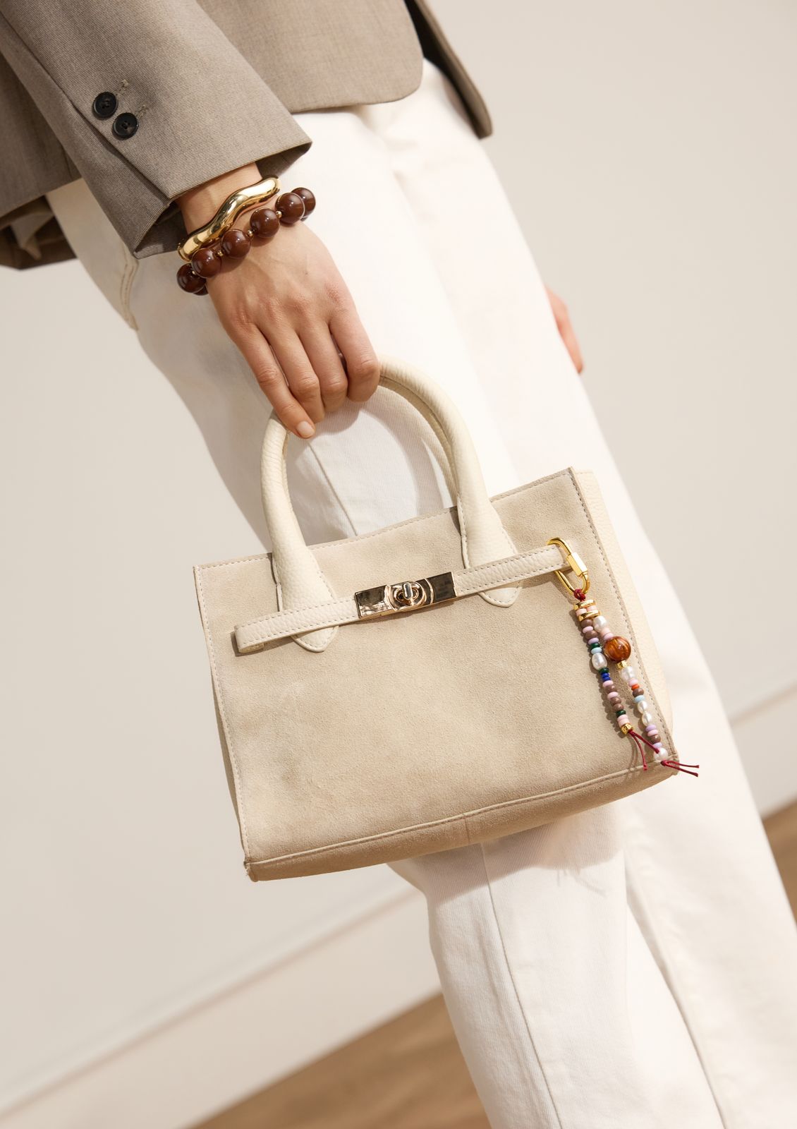 Off white suède handtas van Manfield met gouden ritssluiting en verstelbare band van 110 cm. De afmeting van de tas is 25x18x10 cm (BxHxD).