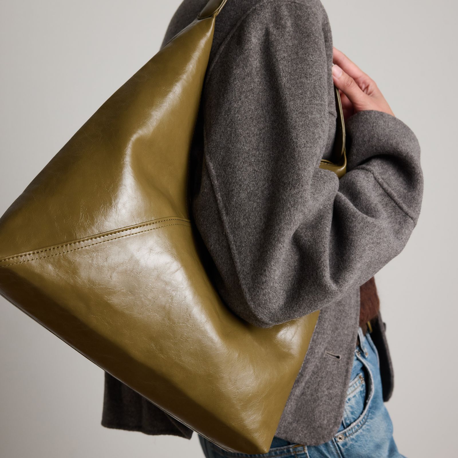 Olijfgroene lak schoudertas van Manfield met drukknoopsluiting. De tas heeft een afmeting van 46x20x14 cm (BxHxD).