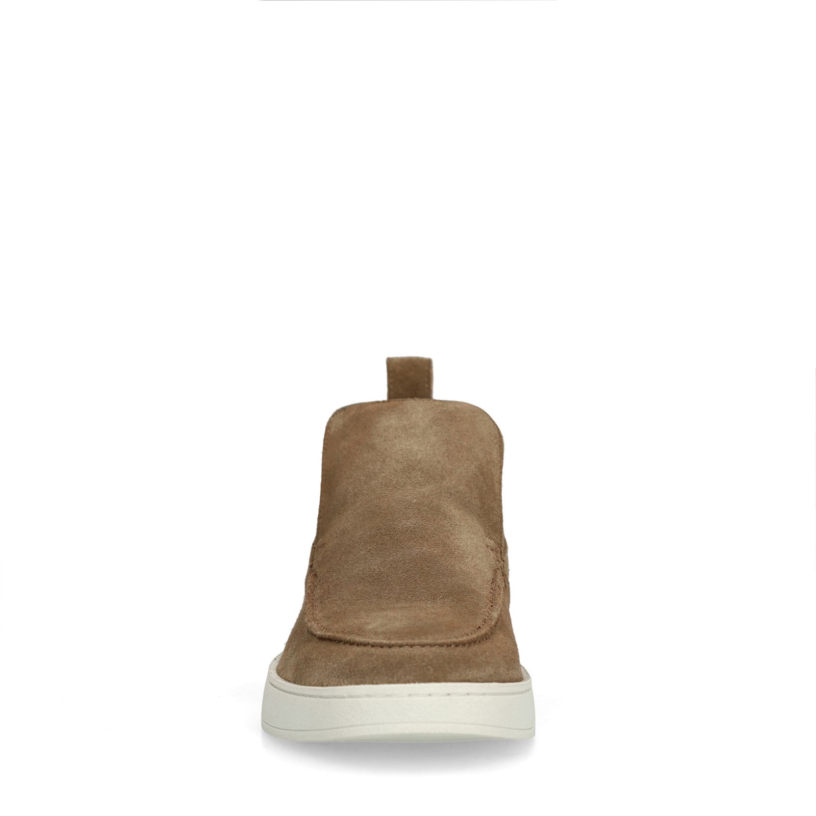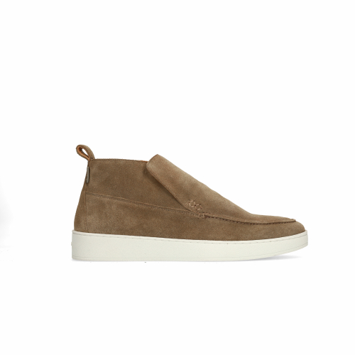 Taupe suède loafers van Manfield. De loafers hebben een witte plateauzool van 3 cm, een uitneembare binnenzool en we adviseren als bescherming en verzorging de suède/ nubuck spray in transparant.
